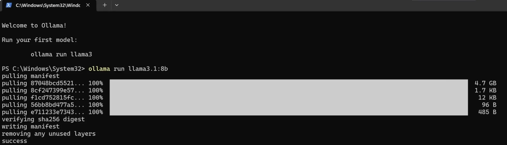 这个命令会在第一次运行时自动下载所需的模型文件,并将它们存储在默认目录中。Llama 3.1-8B 模型需要至少 8GB 的显存来运行,适合个人开发者或中小型项目。