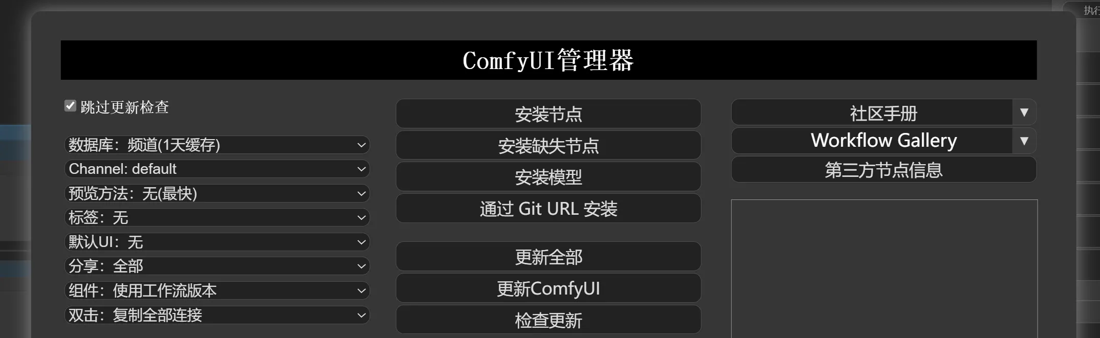 Comfy UI 的许多功能和节点都依赖插件实现,但手动安装插件耗时较长,尤其是在加载新的工作流时需要安装大量节点。为了解决这个问题,可以借助 manager 插件来简化安装与管理节点的流程。该插件允许一键安装缺失插件,自动更新已安装的插件,极大地提升了效率。使用时只需在插件管理器中选择相应的插件或节点库,系统会自动进行安装与升级。