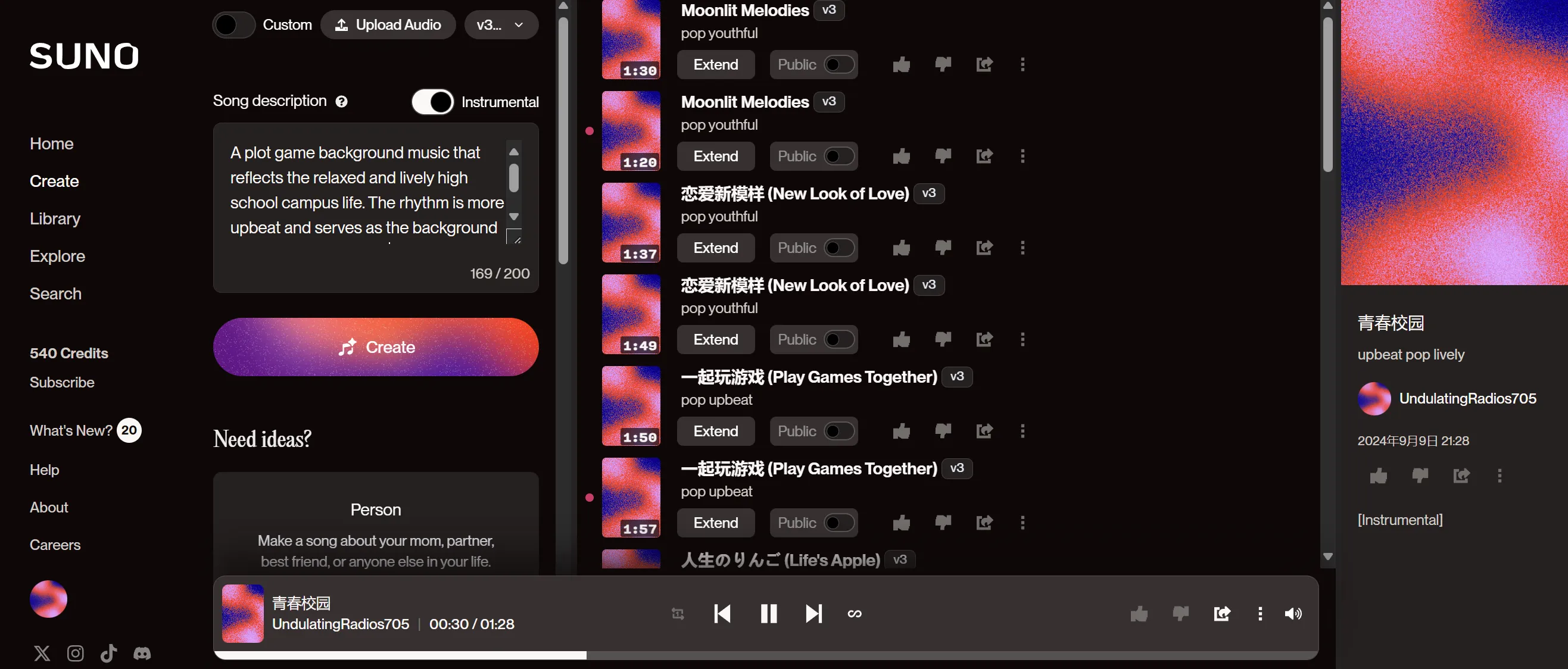 Suno:进入官网,任选社交媒体账户登入即可获得免费额度。在create页面中输入需求即可创作。仅适合非大陆及港澳台地区。