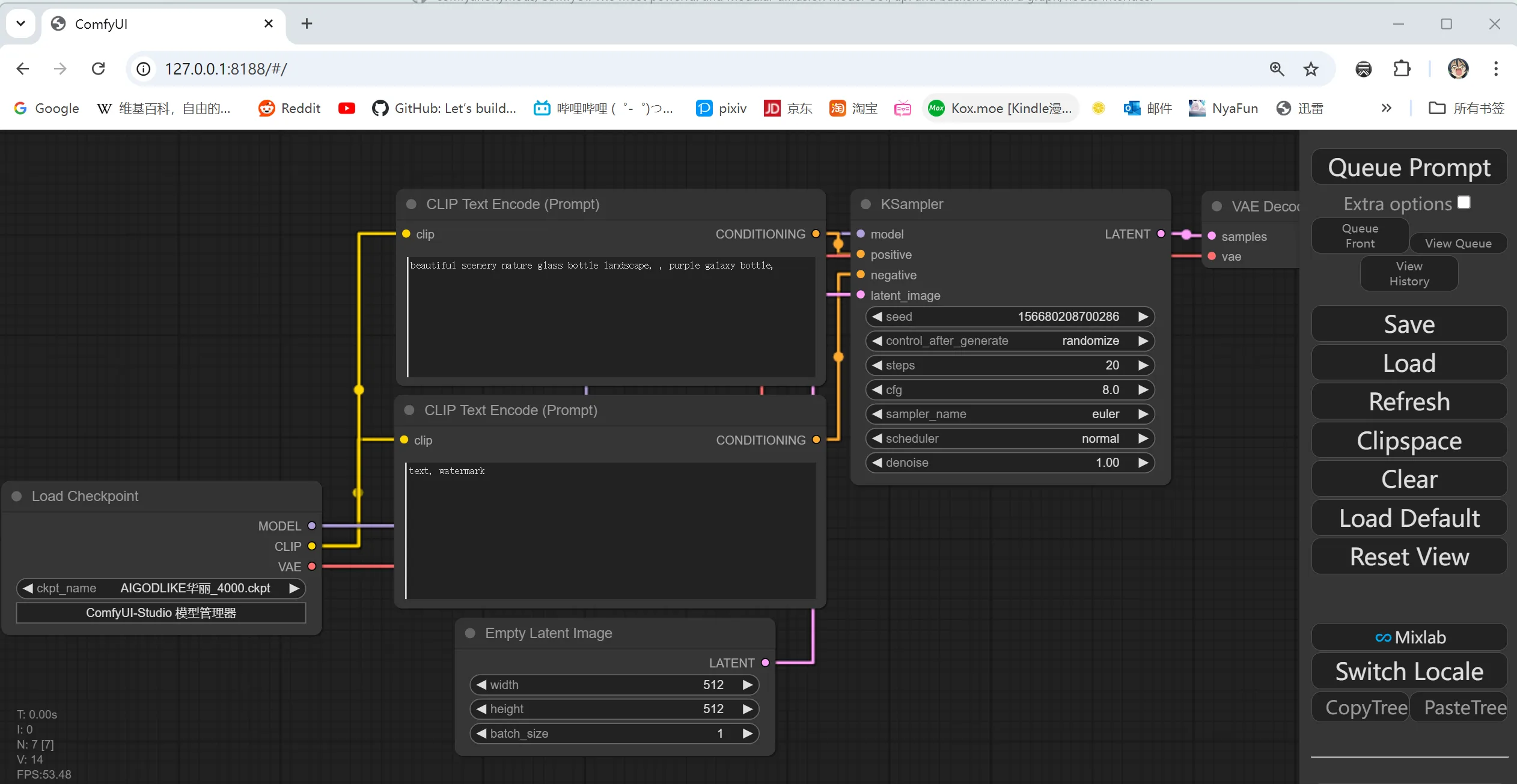 启动完成后,Comfy UI 将可以通过本地的 Web UI 进行访问,在 http://localhost:8188 上。通过网页界面,我们就可以直接进行节点编辑、工作流制作和图像生成了。
