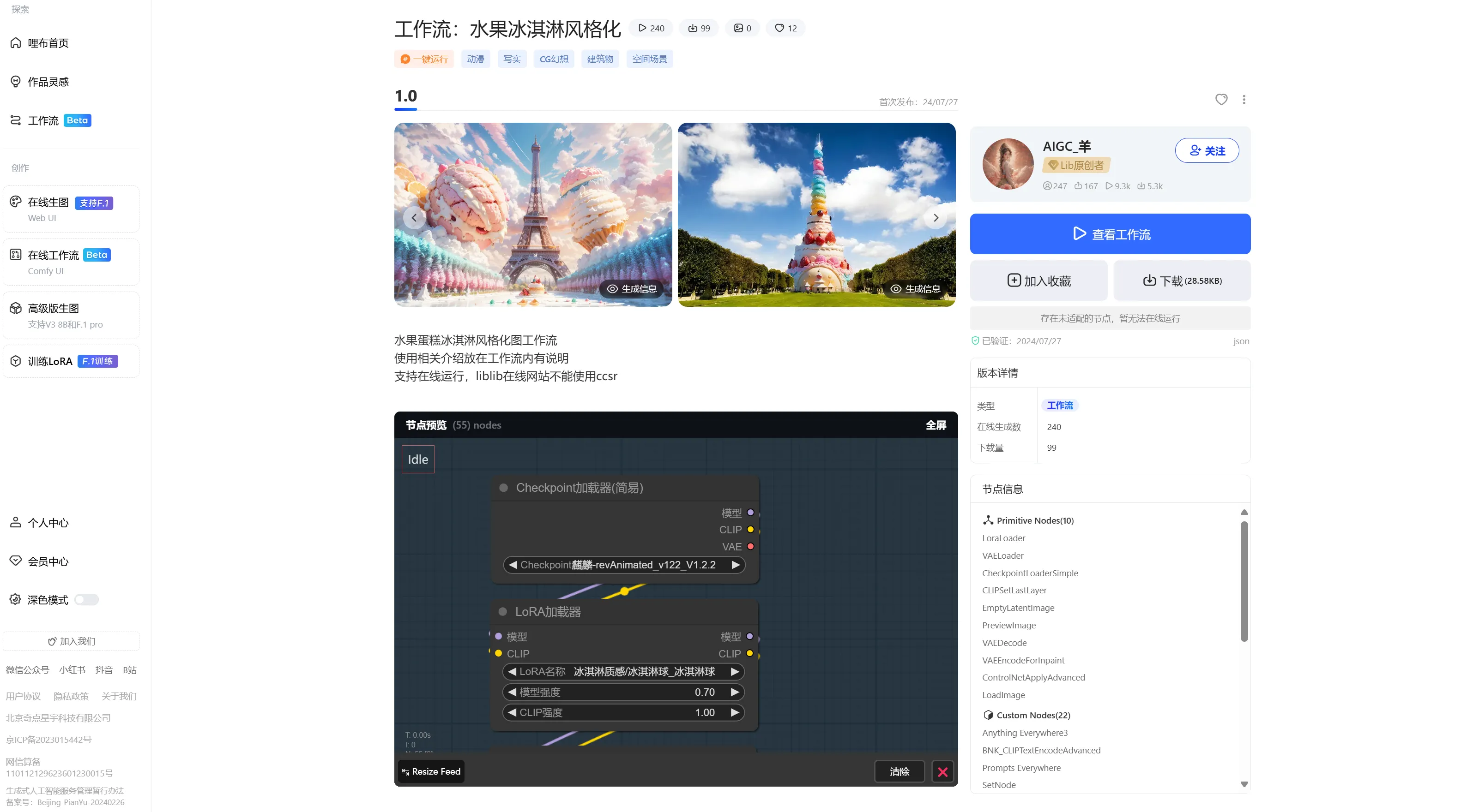 此外,得益于国外HuggingFace与国内LibLib等开源社区,许多Checkpoint、Lora和comfy UI工作流可以直接使用,使得角色风格更丰富更容易控制。在提示词超市(亦称为标签超市、魔导书)中,也可以随心选择需要的提示词组合,更方便的控制和微调图像生成结果。