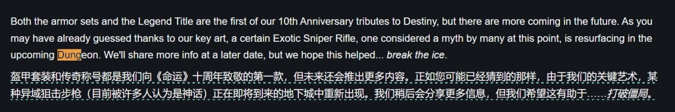 在10周年的文章中,透露下赛季的地牢的金枪是一把异域狙击步枪,而这篇文章的封面任务手持的是一把命运2中未曾出现的狙击步枪