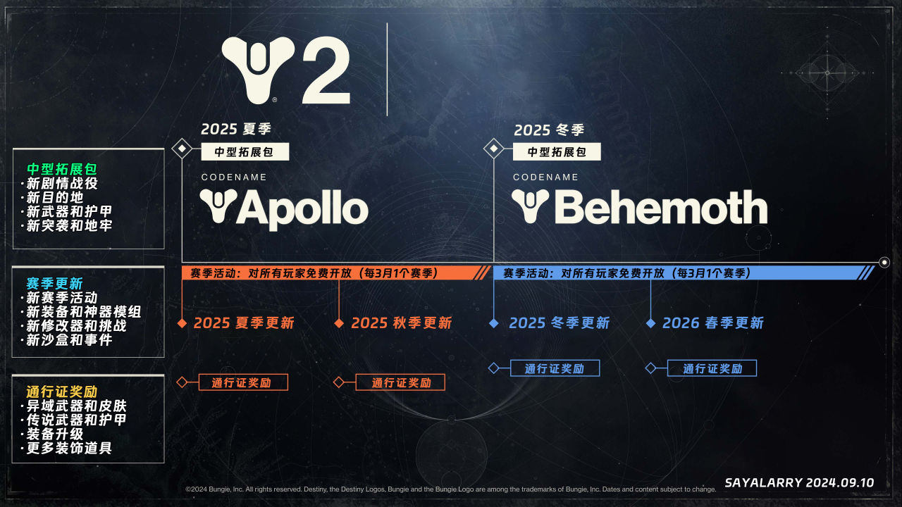 明年分2个中型拓展包更新(月球),不再是1个大型拓展包(苍白之心),每个拓展包包含2个赛季(每个赛季3个月)
