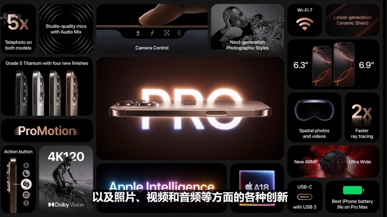6。iPhone Pro,配备A18 Pro,拍照按钮支持调整焦距和精细化操作,增加风格化的图像编辑调色功能,电影感慢动作拍摄,支持4K120帧拍摄,拥有专业拍照取景功能。电影混音功能,分离人声和背景声音轨。