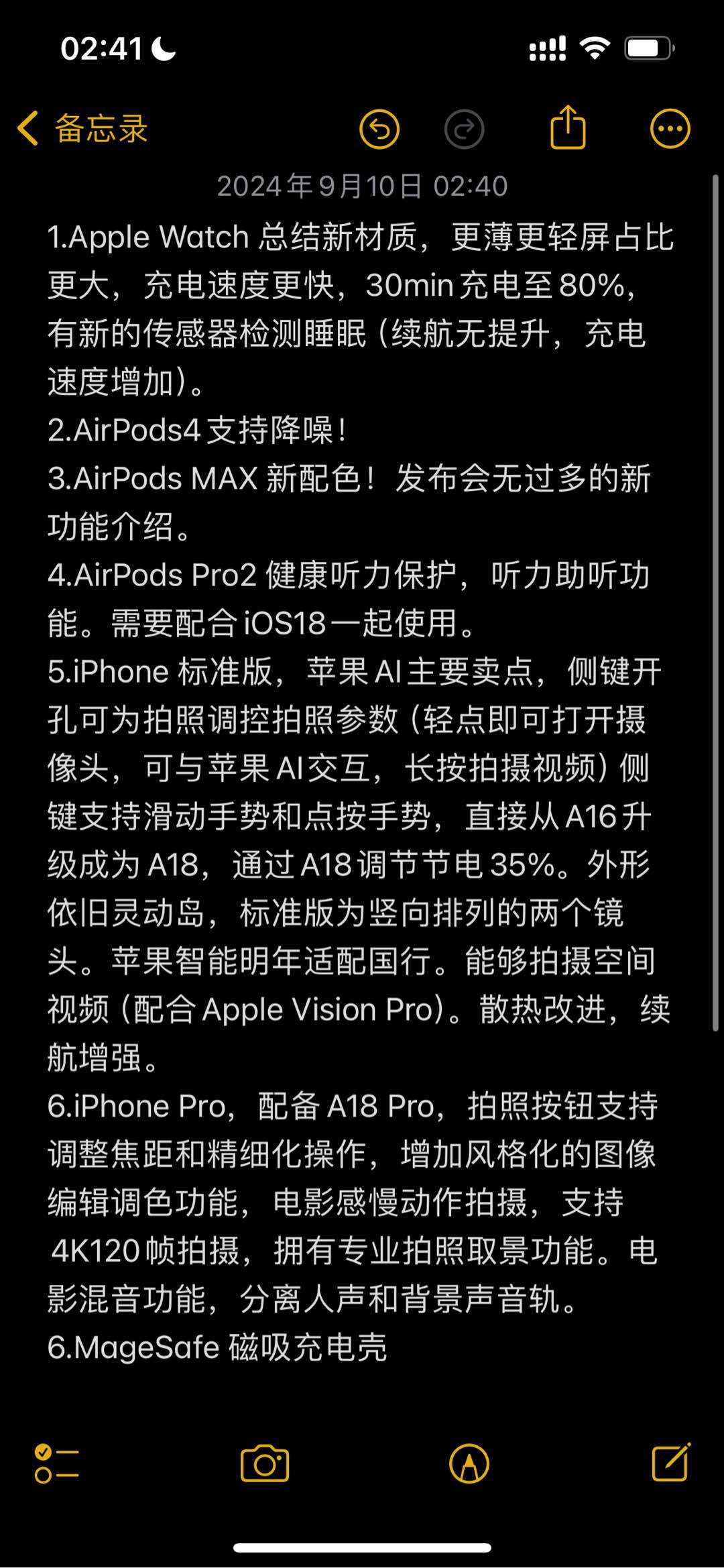 5。iPhone 标准版,苹果AI主要卖点,侧键开孔可为拍照调控拍照参数(轻点即可打开摄像头,可与苹果AI交互,长按拍摄视频)侧键支持滑动手势和点按手势,直接从A16升级成为A18,通过A18调节节电35%。外形依旧灵动岛,标准版为竖向排列的两个镜头。苹果智能明年适配国行。能够拍摄空间视频(配合Apple Vision Pro)。散热改进,续航增强。