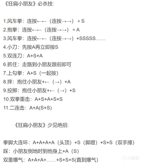简单的方向键操作,A是轻拳,S是重拳。看起来是不是和双刃战士一样,一共也就是六个按键。那你就是小看这款游戏了,游戏中的连招复杂到格斗游戏的程度。小时候的我就是滚键盘,唯一会的就是一套大风车拳,不仅帅而且伤害还高。