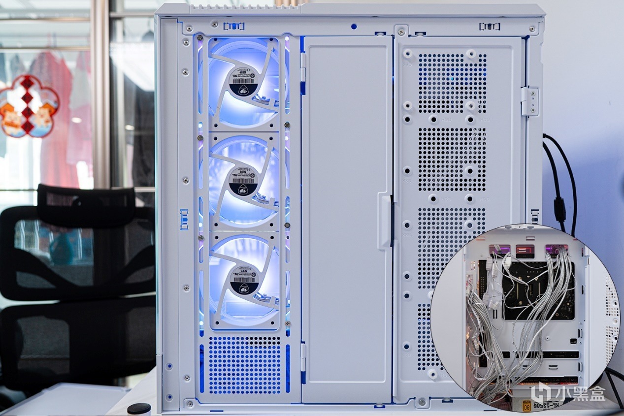 打開側蓋,可以看到合頁轉軸遮線板,不考慮理線的情況下,機箱內部也能有乾淨整潔的效果,裝機小白表示很舒服~愛國者星璨大嵐屏顯版右側柵格板可以安裝4塊2.5英寸盤,或者2塊2.5英寸盤+2塊3.5英寸盤,內部電源倉一側還可以安裝一個2.5英寸盤,拓展性很強。
