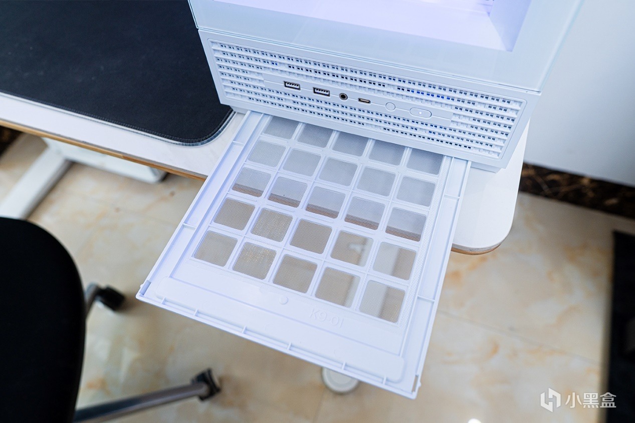 底部的話,愛國者星璨大嵐屏顯版使用了一整塊抽拉式防塵網,可以快速取出。愛國者星璨大嵐屏顯版機箱的頂蓋、左右面板、底部、電源架等可以快速拆卸,裝機過程相對會輕鬆不少,