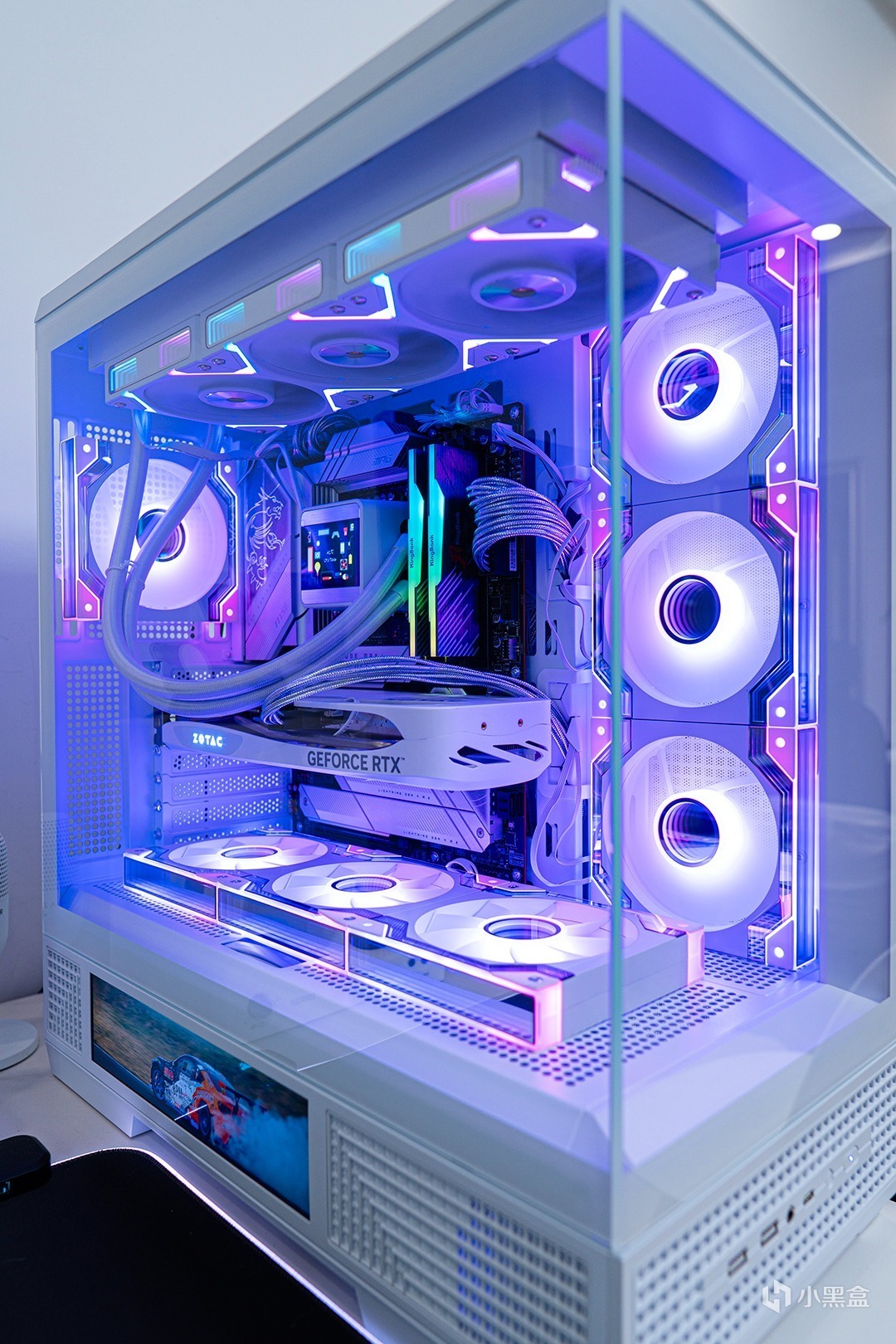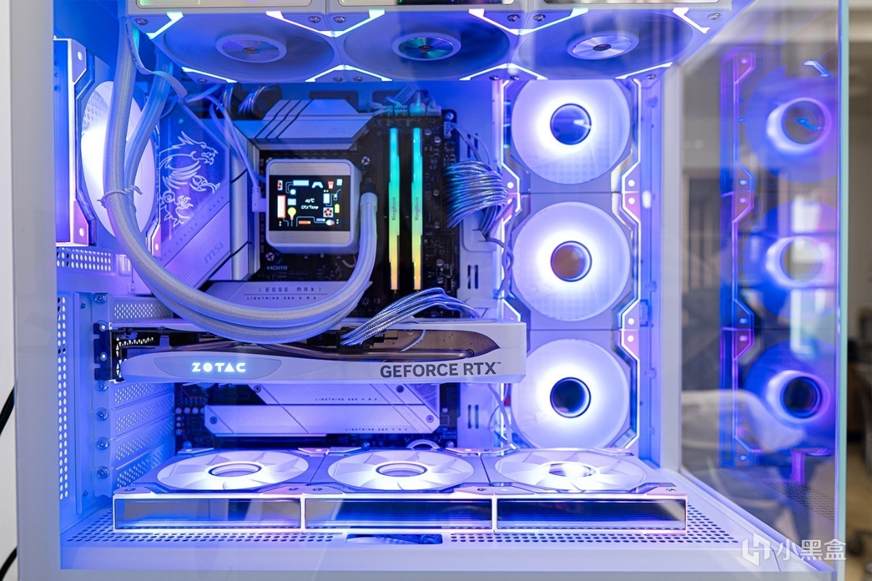 愛國者星璨大嵐屏顯版內部最多支持安裝10個風扇,均爲120mm規格,我這裏風扇已經裝齊了,水冷型號爲鑫谷崑崙MU-360,冷頭也帶有自定義IPS屏,模組拼接積木風扇線材較少,帶ARGB效果,風扇使用的是骨伽靈鏡V2 PRO,本身燈光區域比較大,另外4面ARGB無限鏡+中心無限鏡效果讓燈效看起來更立體,骨伽靈鏡V2 PRO支持800-2000RPM PWM調速,噪音低至37.1dBA,非常安靜。