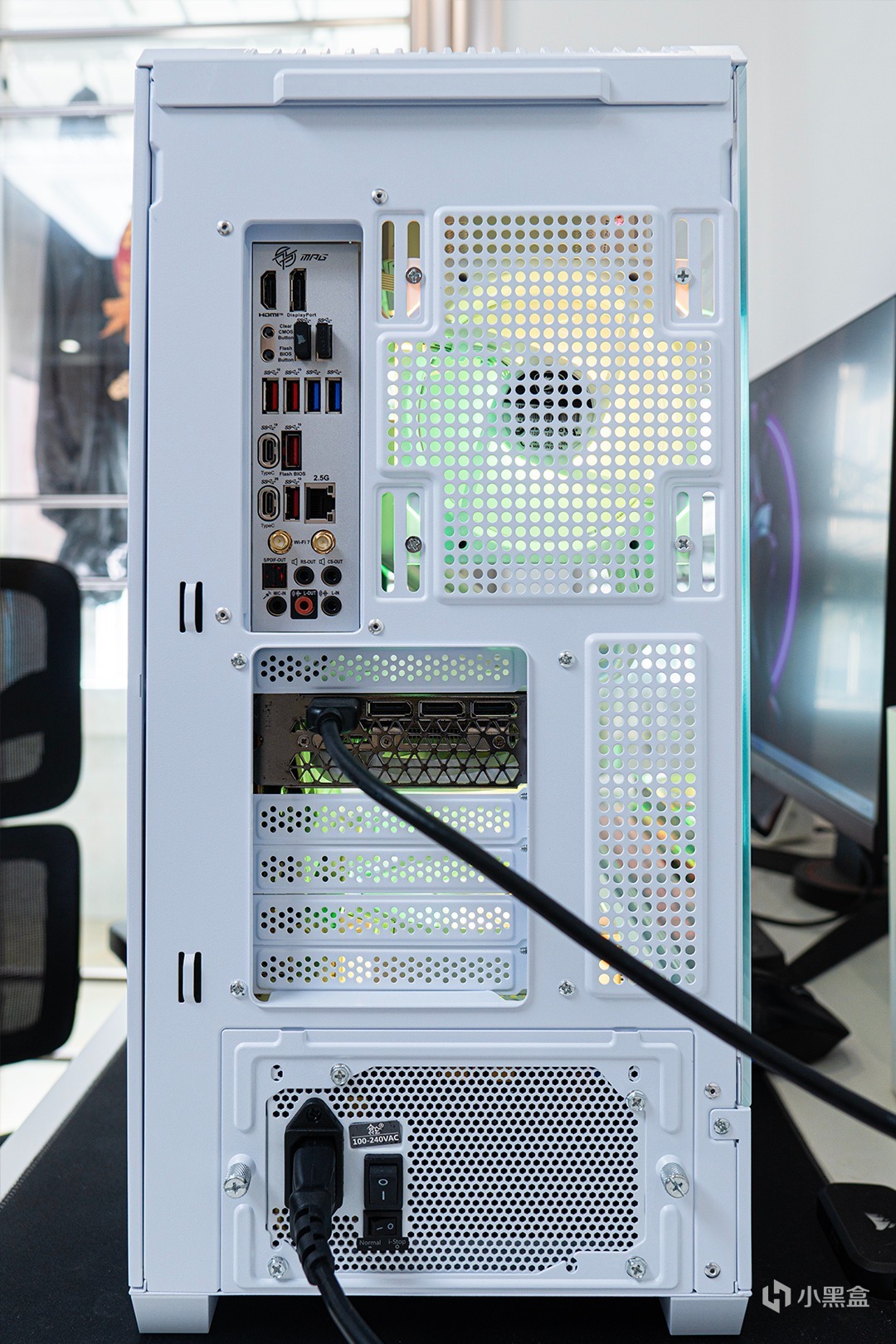 從背部看,愛國者星璨大嵐屏顯版有7個PCI拓展槽,我這裏顯卡佔用了兩個,其他位置後續可以升級PCI網卡或者聲卡,這裏PCI拓展槽方向不能切換,也就是說顯卡只能橫向安裝。電源位置,愛國者星璨大嵐屏顯版使用了可拆卸的電源架,側面不好塞入的電源可以先裝在電源架上,然後插入機箱。
