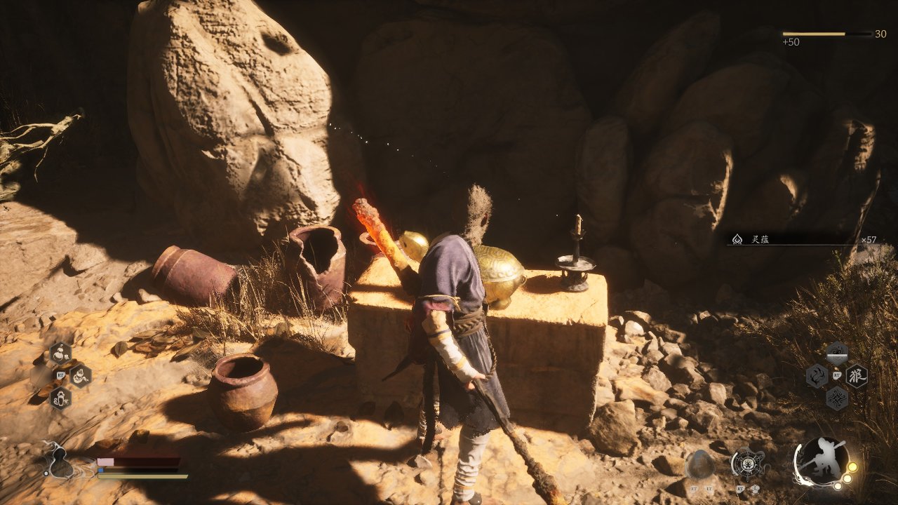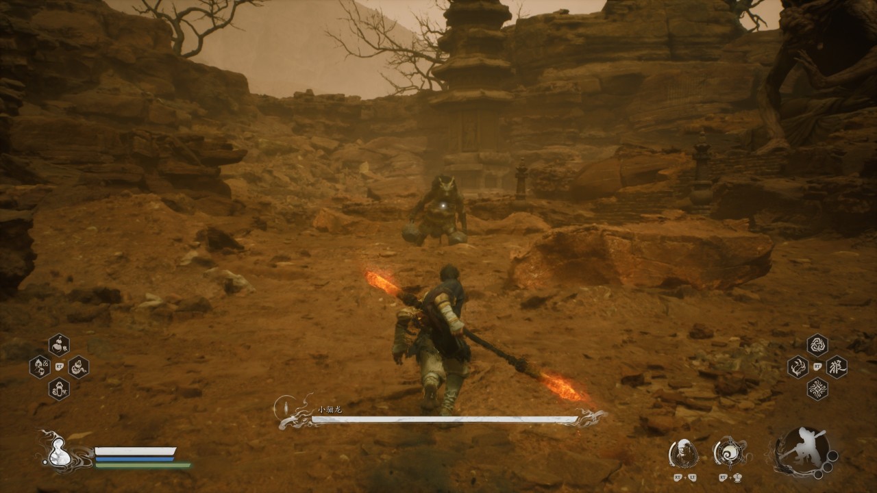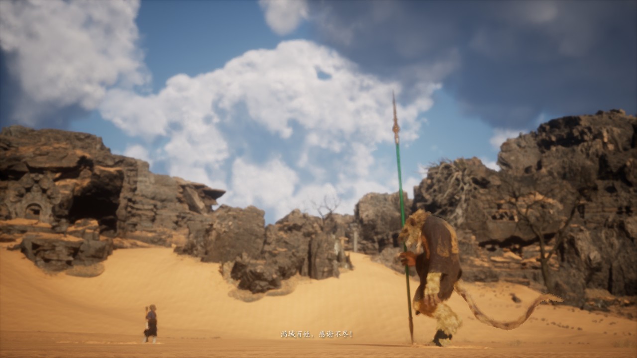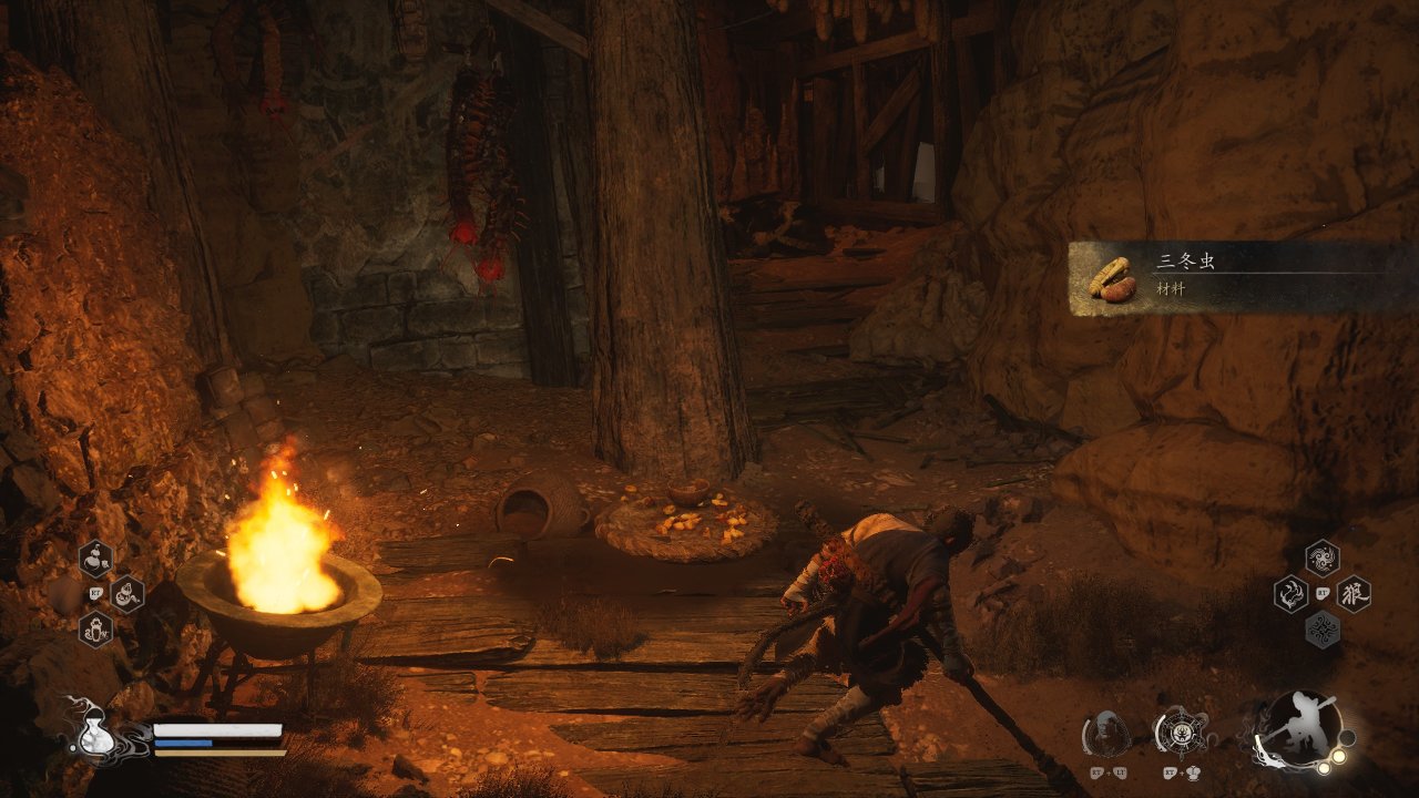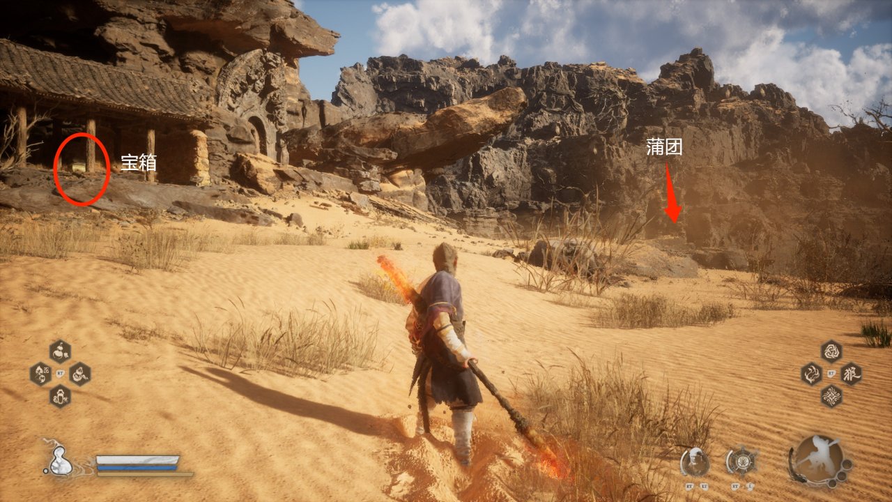 兩邊都搜刮完畢後我們回到土地廟的位置,往前走和黃風大聖對話,之後跳下平臺討伐蝜蝂,boss血量到一定程度黃風大聖就會幫忙。戰勝之後獲得【法寶】定風珠和材料【通天角】。土地廟解鎖披掛【昆蚑套裝】。