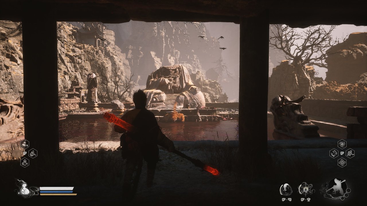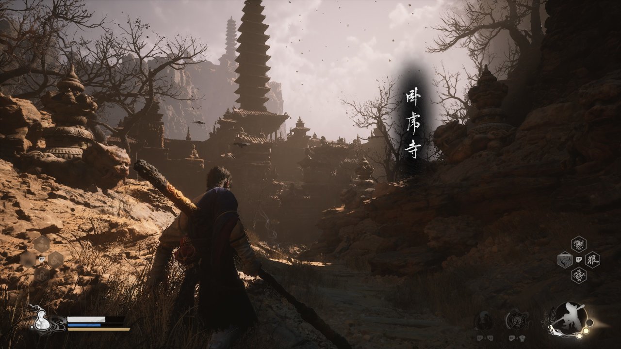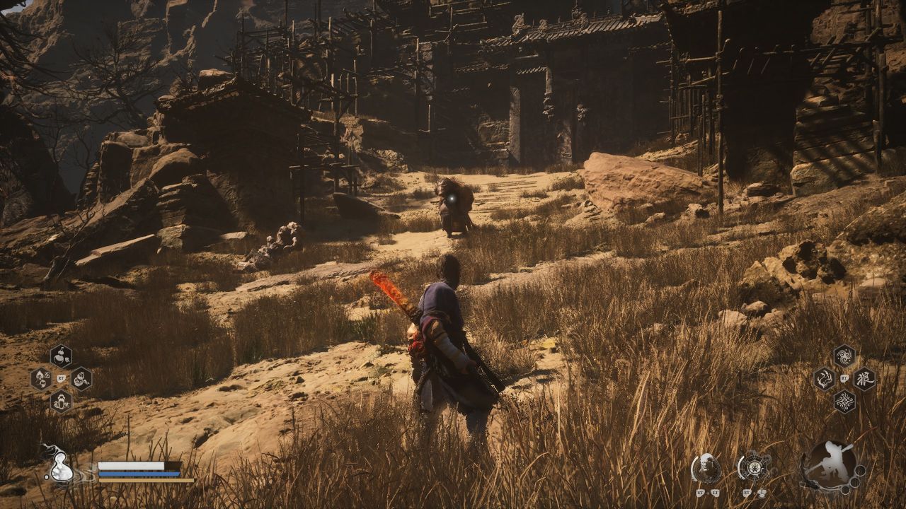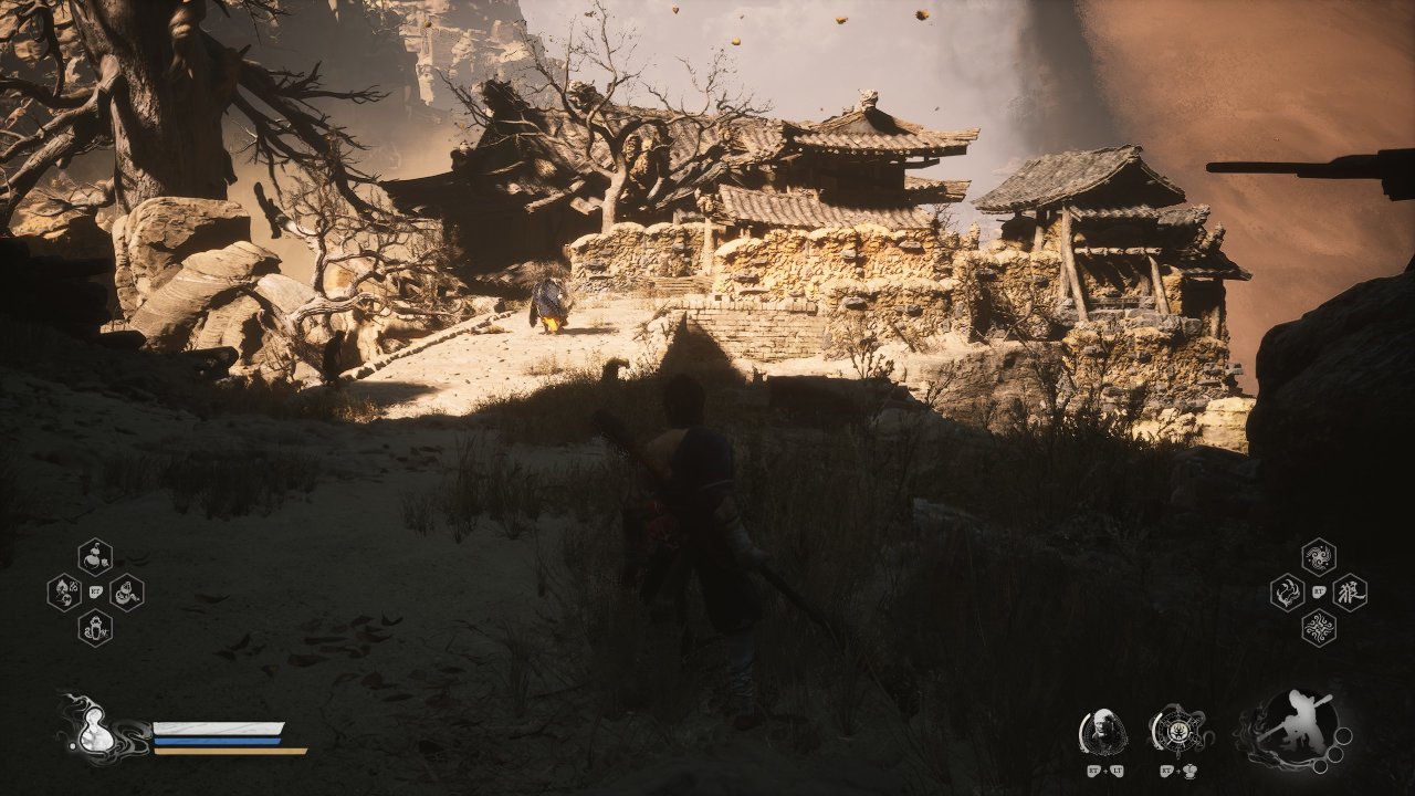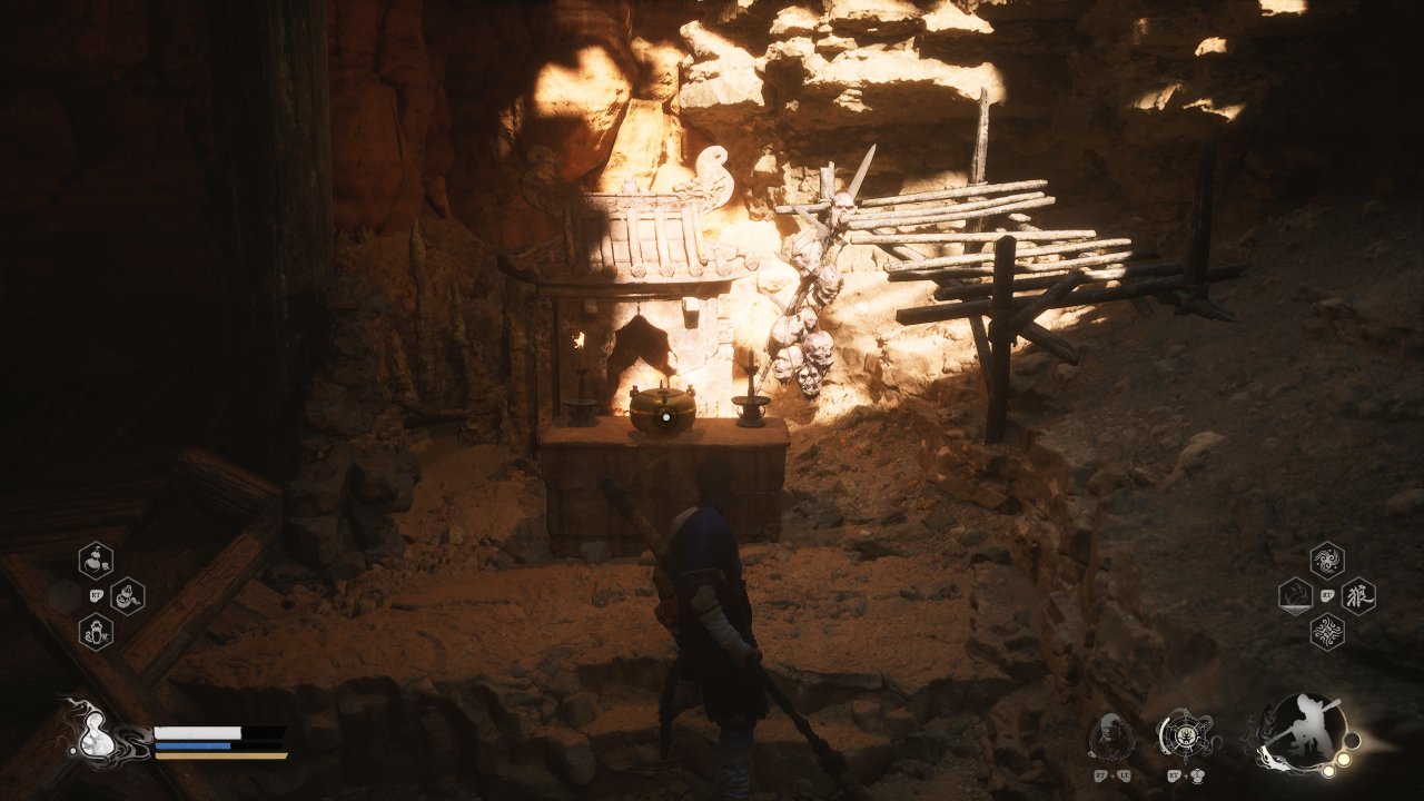 兩邊都搜刮完畢後我們回到土地廟的位置,往前走和黃風大聖對話,之後跳下平臺討伐蝜蝂,boss血量到一定程度黃風大聖就會幫忙。戰勝之後獲得【法寶】定風珠和材料【通天角】。土地廟解鎖披掛【昆蚑套裝】。