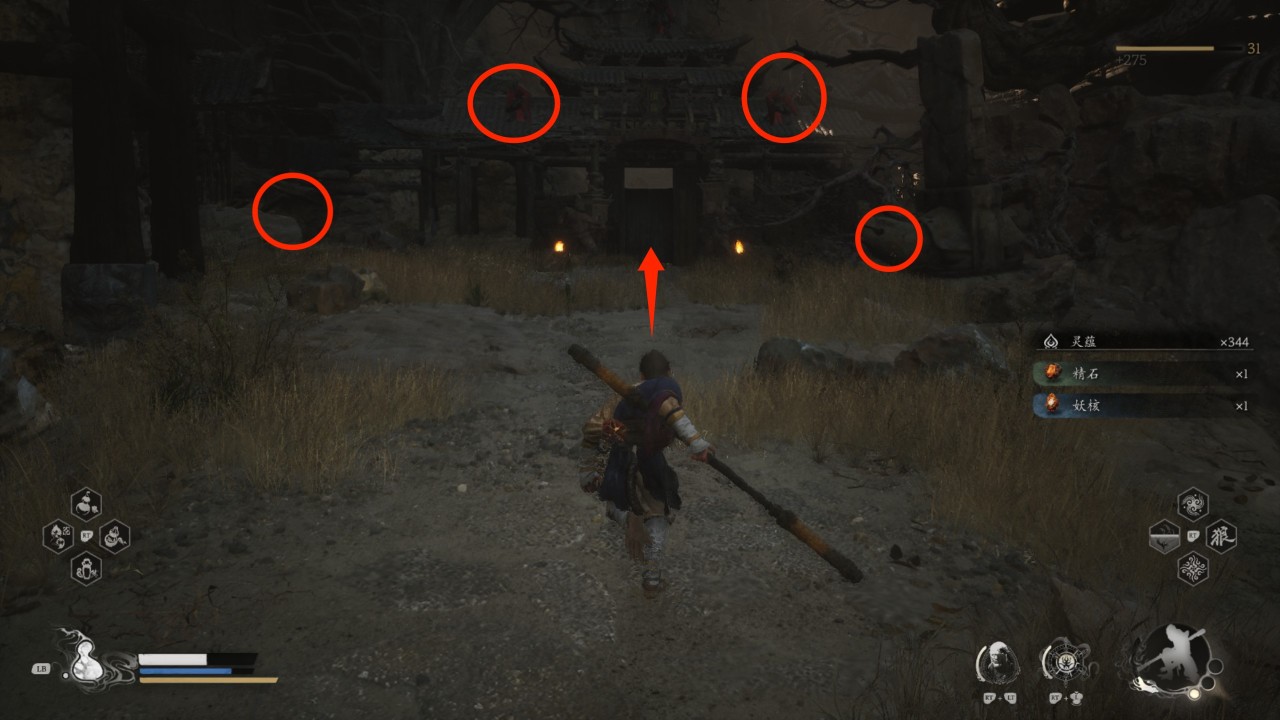 沿着石子路前進,左邊的院子可以搜刮一下,前面有一個精英敵人,擊敗後獲得【精魄】鼠司空。