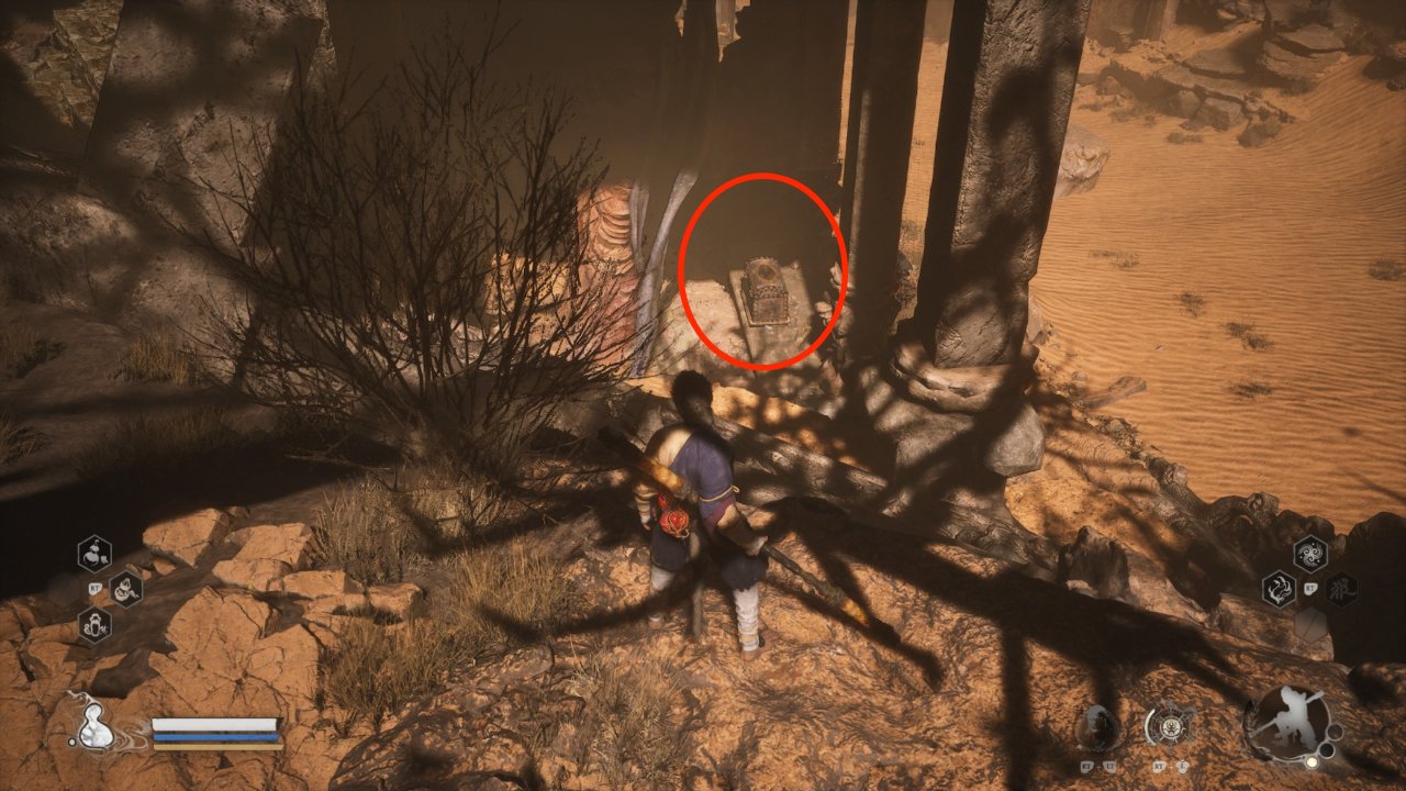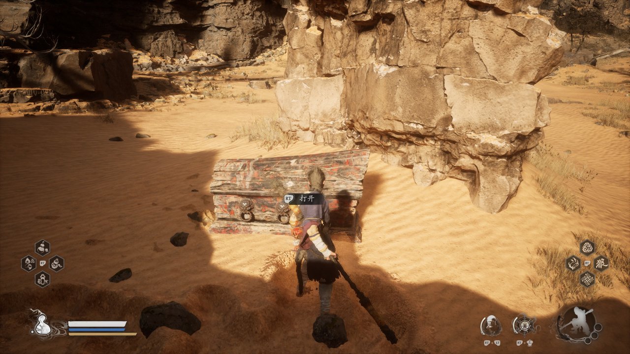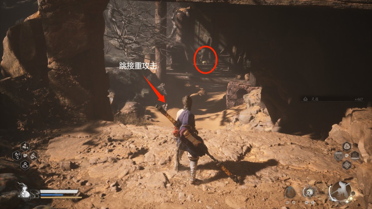 走出洞窟來到這個沙坡前,注意看前面平臺有個盒子,到一定距離跳躍接重攻擊就可以跳上平臺。