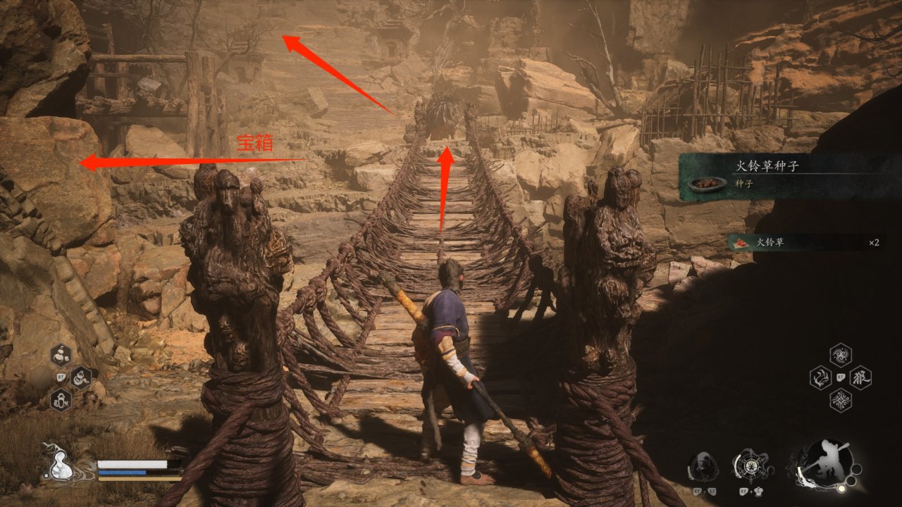 滑坡的時候可以看到左側平臺上有弩手,把握好時機可以跳上去,前方亭子裏有一個寶箱。