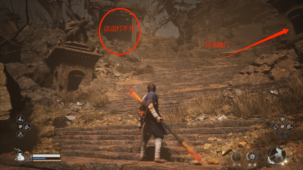 一路往上走可以看到一扇大石門,後面是我們對戰沙鼠父子的場地,這邊打不開,右邊有一條小路走右邊上去。
