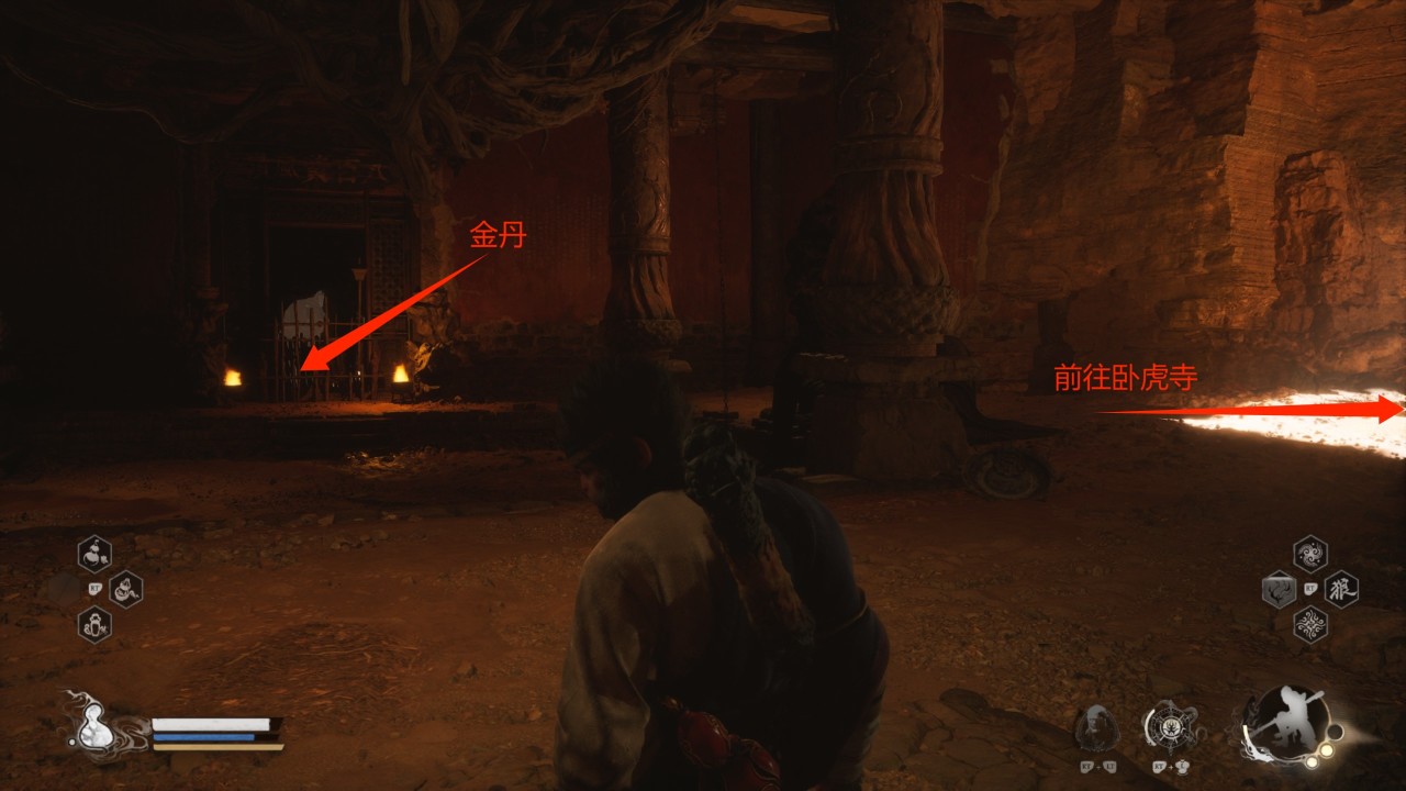 鑽入縫隙後被一隻蝙蝠突臉,打死之後獲得【精魄】疾蝠,吸收完精魄之後我們先往前走拿一顆金丹,然後在走右邊前往臥虎寺。