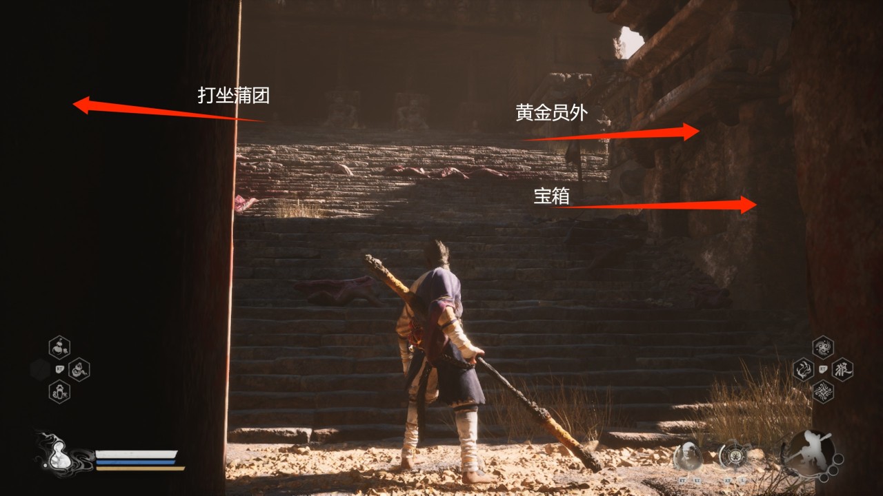 前往挑戰虎先鋒的時候別走太急,階梯左右一共三個地方要去,右邊拿一個寶箱還有和黃金員外對話,左邊有一個蒲團。