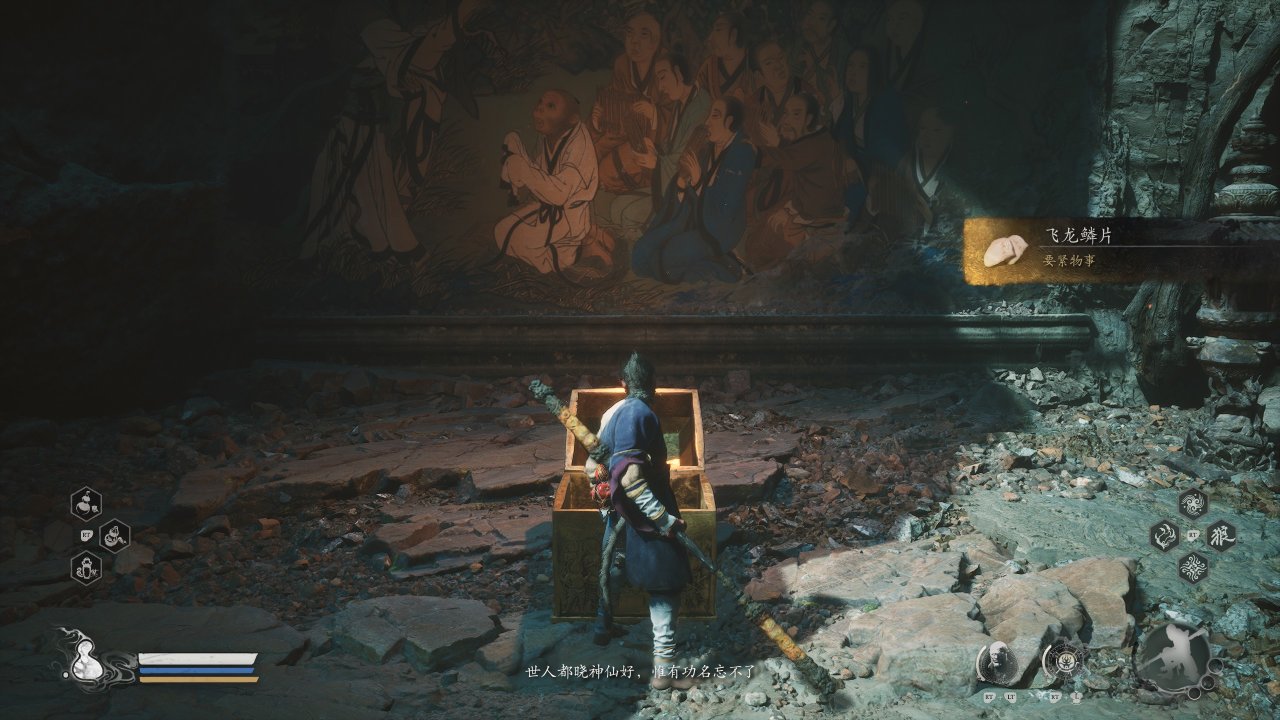 鑽進縫隙後可以拿到【飛龍鱗片】,還可以看到悟空拜師菩提的壁畫。