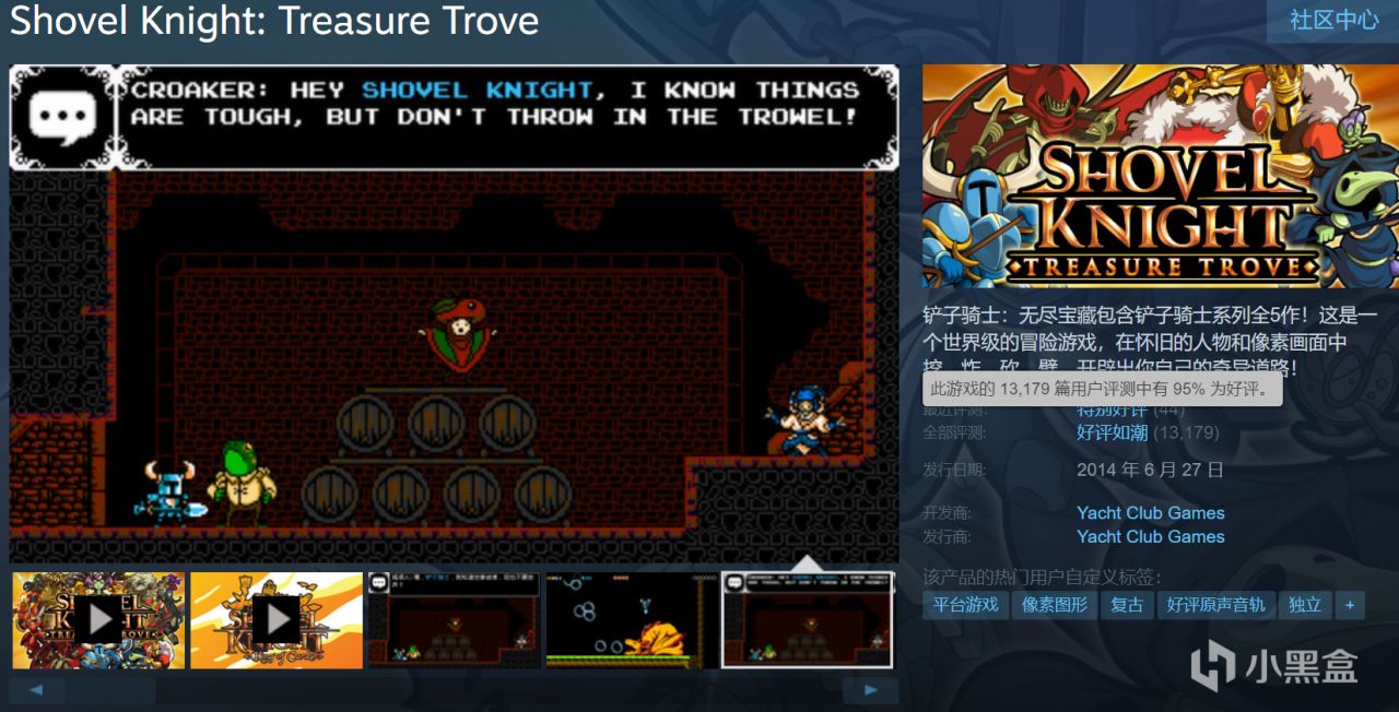 《鏟子騎士》(Shovel Knight)是由Yacht Club Games發行的一款8-bit風格的動作冒險遊戲,於2014年06月27日在中國大陸發行,本遊戲主題爲一個揹負巨大任務的小騎士來到山谷去完成兩個目標,遊戲評分極高,是同年發售遊戲中最優秀的遊戲之一,喜歡清版街機風格遊戲的玩家不容錯過,在steam上推薦購買合集版《Shovel Knight: Treasure Trove》,包含了目前的全部五作。