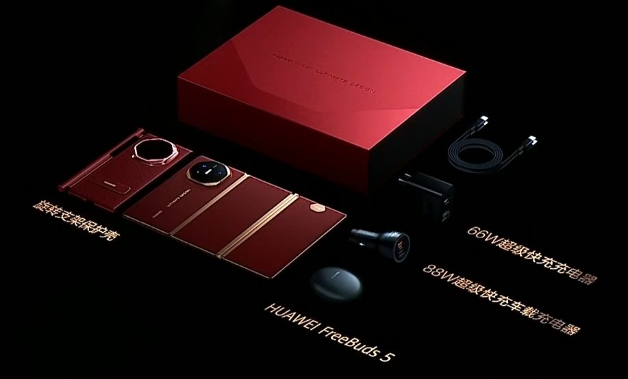 华为 Mate XT 非凡大师还配备了丰富的配件,包括旋转支架保护壳、FreeBuds 5、88W 超级快充车载充电器和 66W 超级快充充电器等。