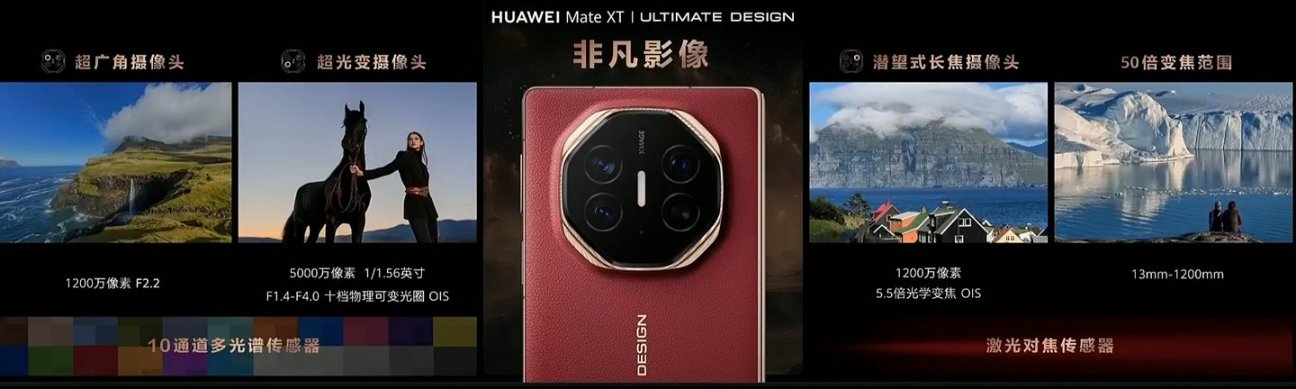 在影像能力上,华为 Mate XT 非凡大师同样不容小觑。它搭载了 50MP 1/1.56" 十档可变光圈主摄(F1.4~F4.0),以及 12MP 超广角 + 12MP 潜望长焦(5.5x)后置镜头组合,为用户带来更加专业级的摄影体验。