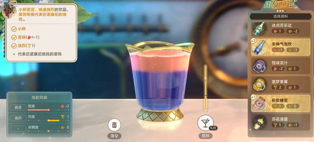 在該玩法中,玩家作爲“驚夢酒吧”的調酒師,爲前來解憂的NPC調製酒水。活動“杯中逸事”並未像《賽博酒保行動》那樣提供大量酒水的配方,而是通過標註出每一種原料對應的甜度、烈度和濃稠度,給玩家更多自由調配的空間。