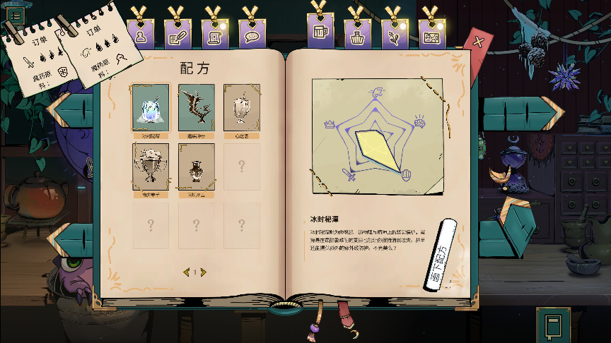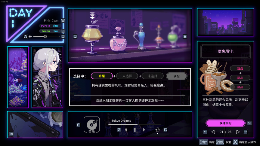 不過,市面現有“賽博酒保like”玩法的遊戲大多依然存在着遊戲性不足的問題。例如上文提到的《魔飲心語》和《水煙水霧》的調製玩法遊戲性就相當有限。例如,在《魔飲心語》中,顧客的要求會以小紙條的方式附加在配方表的左上角,這個要求過於清晰明確,甚至精準到哪種能力需要多少原料,這導致玩家的選擇實際上只是選擇調哪個飲料,調製本身幾乎沒有自由度。