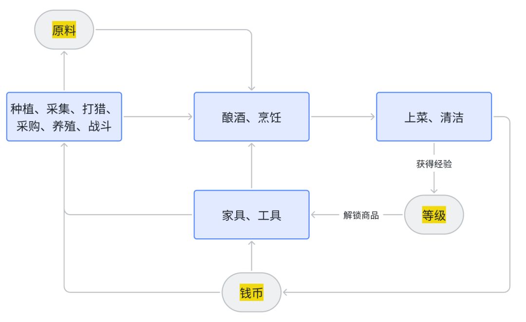 如圖所示,遊戲中涉及的玩法已經遠遠超過了“烹飪模擬”這一範疇,酒館後廚的原料並不完全通過購買獲得,而需要玩家通過種植等方式獲得。再如,玩家需要用掃把趕走喝醉的客人才能有位置容納新的客人,需要把原料放進釀酒桶纔會生產出酒水,這些玩法細節讓酒館經營更加真實,並且這些玩法也是遊戲資源循環的一部分。