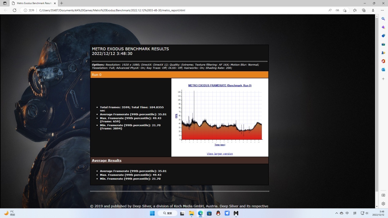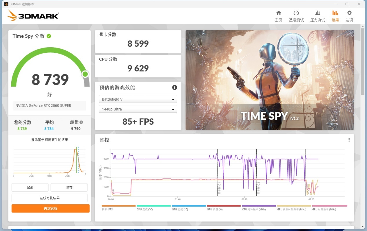 3DMark Time Spy 显卡8599分,成绩比3060 12GB低一二百,比上次测的5700XT低了1000分。