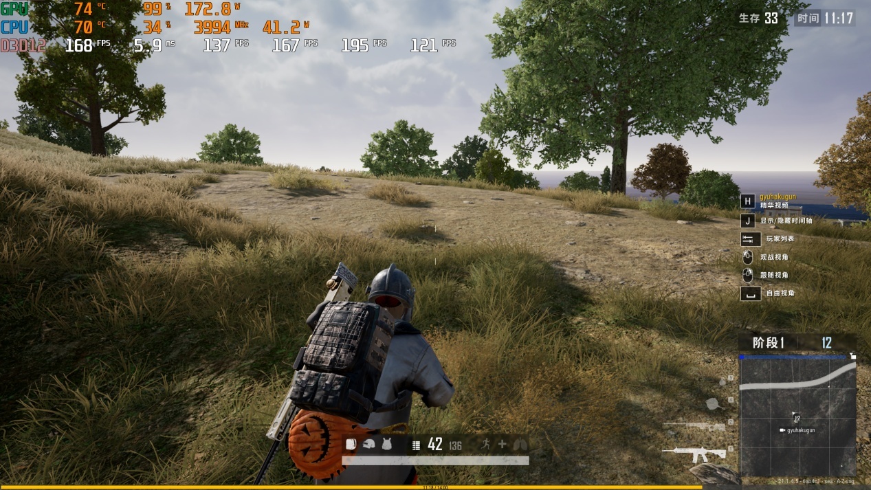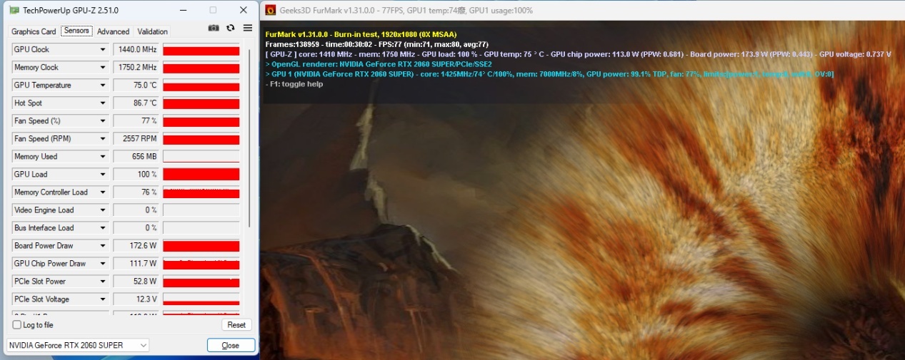 FurMark烤机,跑了30分钟,显卡温度75°(室温26°),显卡功耗满载172W左右,温度表现还可以。