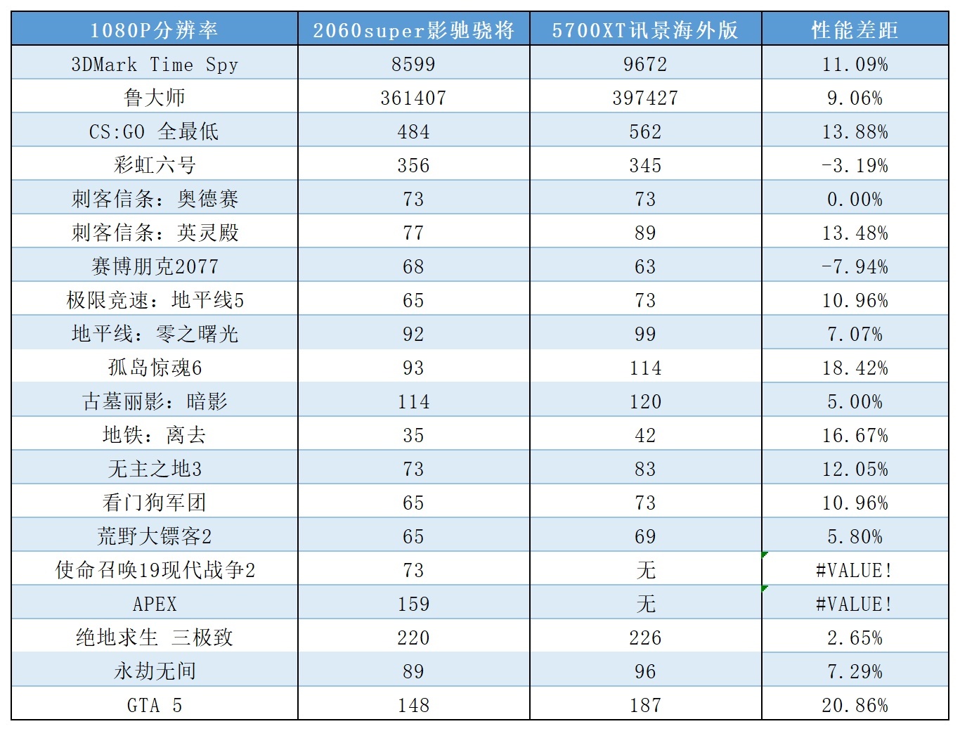 2060super和5700XT应该是目前千元价位最热门的矿卡了,对比之前测试的5700XT讯景海外版测试成绩,2060super整体表现还是要差不少,只在彩虹六号和赛博朋克2077帧数领先,其余均不及5700XT,5700XT比2060super游戏性能综合强9%左右。