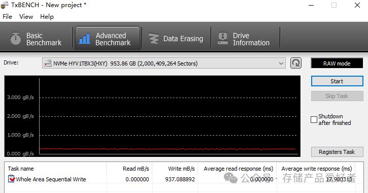 用Txbench测试全盘顺序写入,速度稳定,937MB/S。