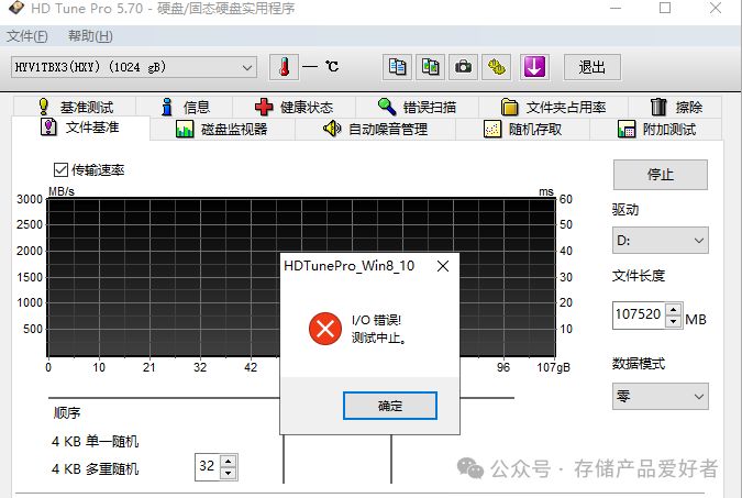 用HDtunepro5.70测传输速度,100G无降速,,超过100G就显示I/O错误。不知道是软件的问题,还是SSD的问题。
