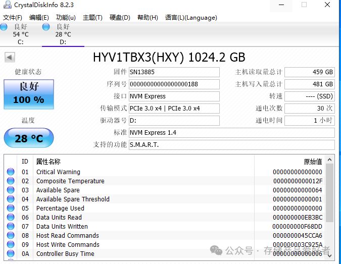 用CrystalDiskInfo,可以查看硬盘的使用状态信息。包括健康度、温度、读取、写入量、通电等。注意,如果你的SSD协议和电脑不匹配,比如PCIe4.0的SSD插到了PCIe3.0的接口,可以看传输模式那里。