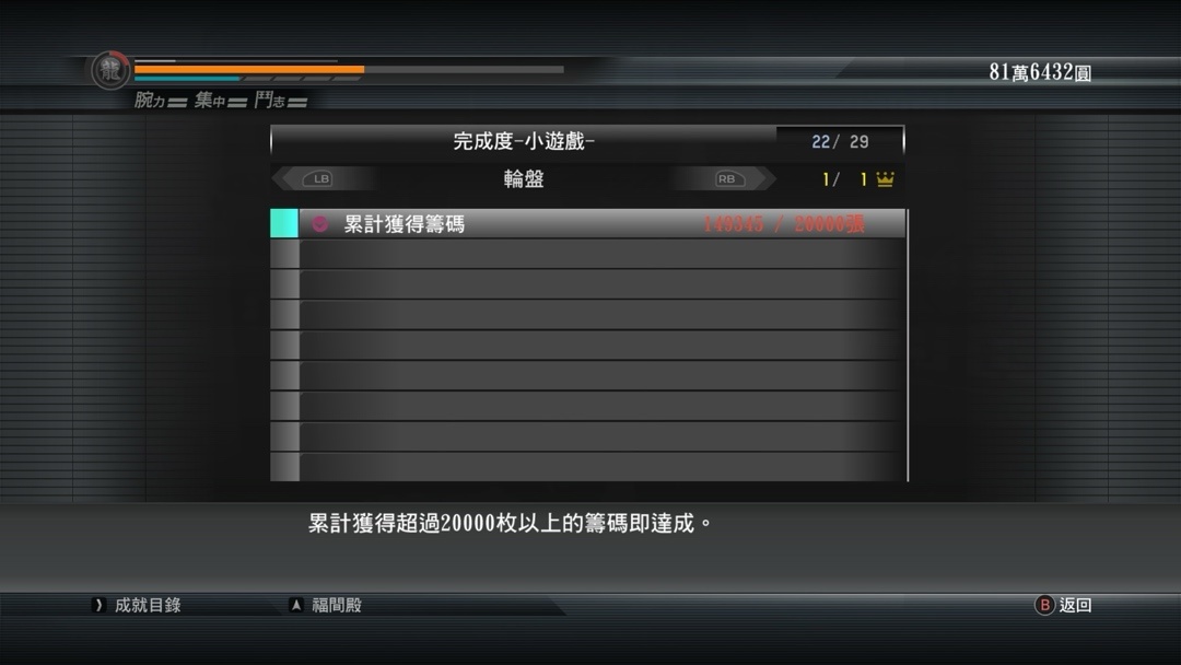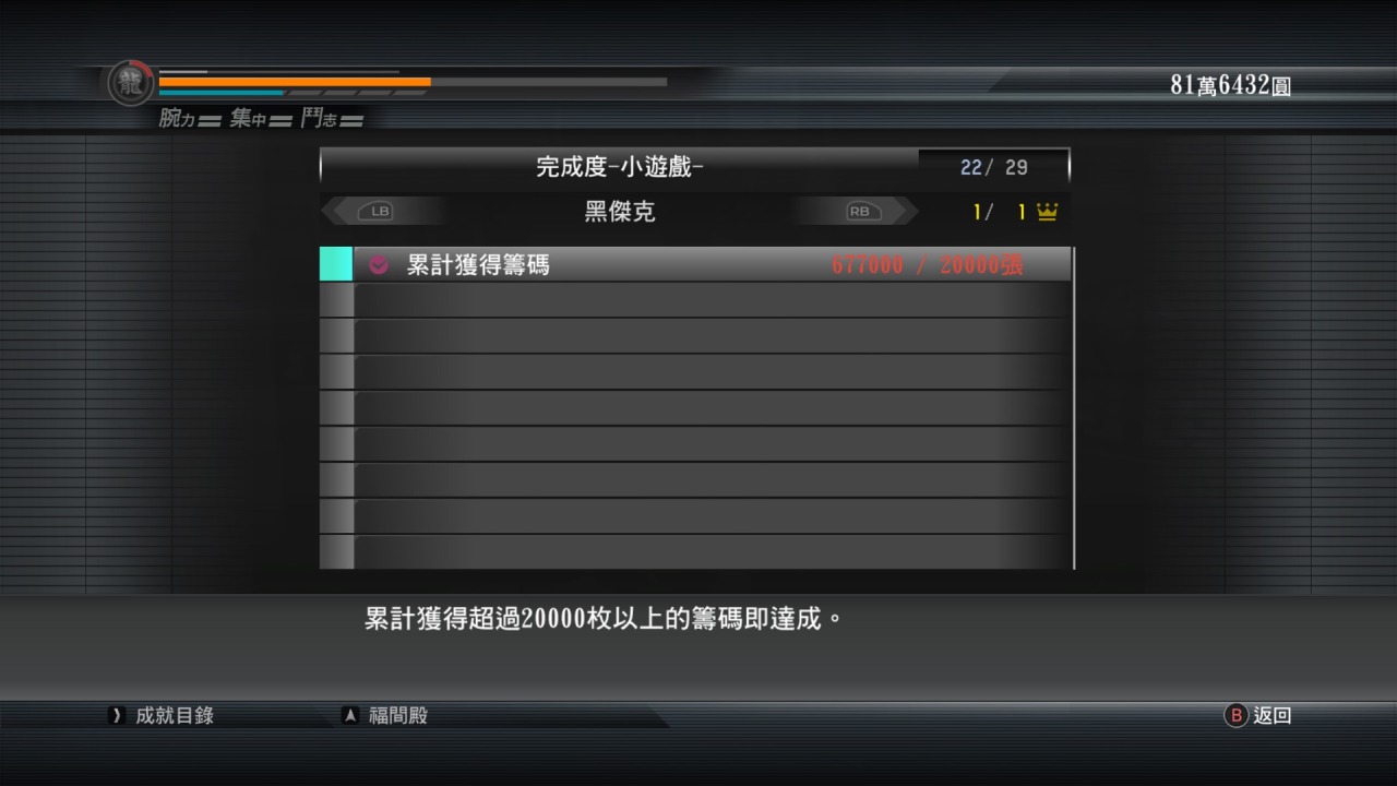在如龙5赚到了全成就的起始资金,到这个阶段俺全成就也要全速冲刺了,如龙5这次很特别再唠叨一句,这次龙5无法在通关后的模式,也就是漫游模式完成的要素继承到二周目,意味着二周目开始只会继承你通关前的内容,不继承你在漫游模式的所有内容,很多二周目想通过一周目得到的等级、能力和武器来攻克最高难度的小伙们一定要注意哦~