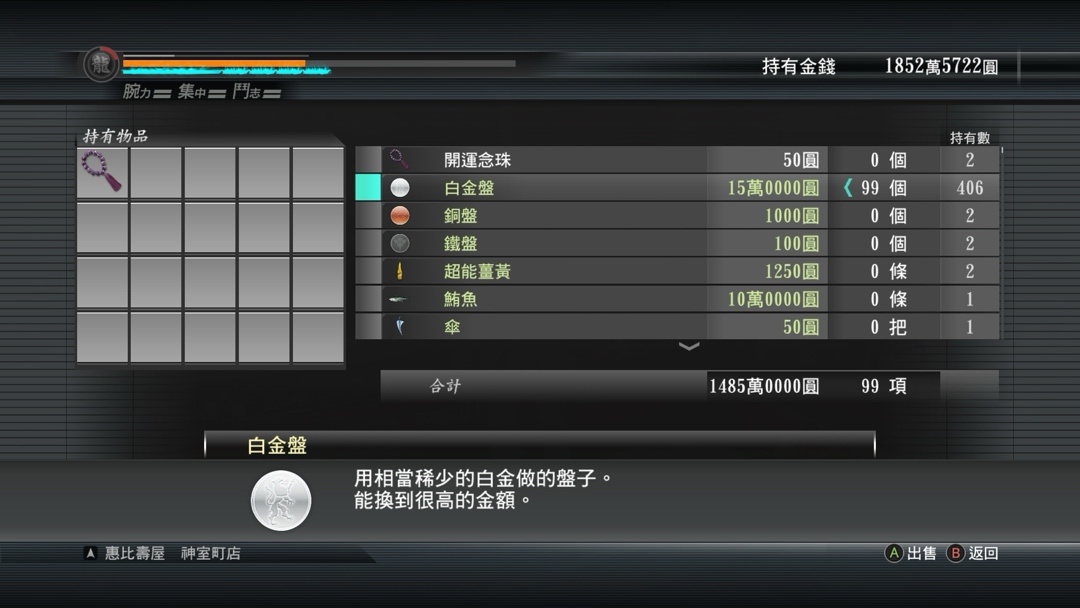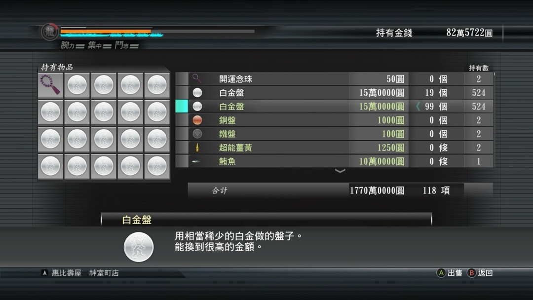 赌博道具全部用完之后,就要找前台去兑换白金盘然后才能到惠比寿屋换钱了,身上一共20个格子然后到对面的竞技场(需要读两次盘而且室内需要走路),或者在另一头只需要读一次盘而且可以跑,个人是两个地方各搬一次,不然来回好几十次同一个地方真的好枯燥,算是体验了一次有钱人的枯燥了(笑)