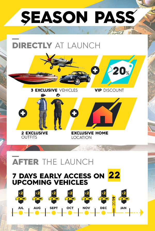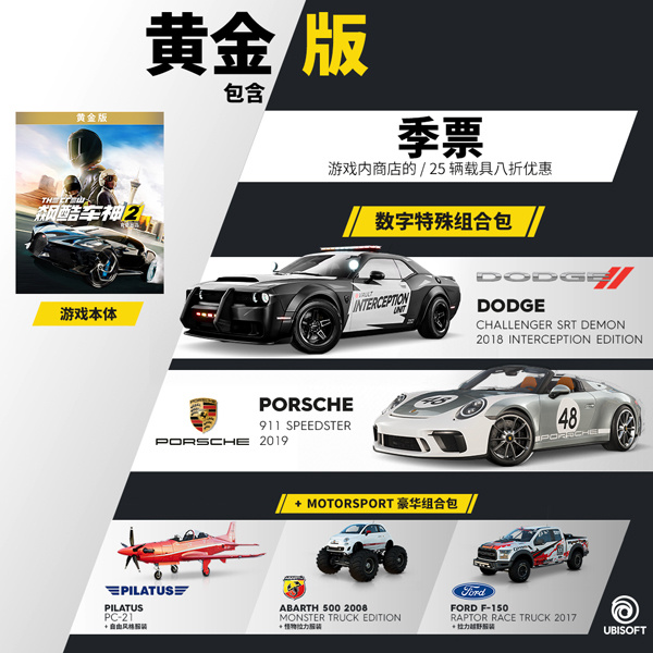 【黃金版】:季票(內含三種獨家載具, 22 臺每月添加載具的提前使用權,以及遊戲內商店購物永久 8 折優惠)+數字特別組合包(道奇挑戰者 SRT 惡魔攔截裝置+保時捷 911 Speedster)