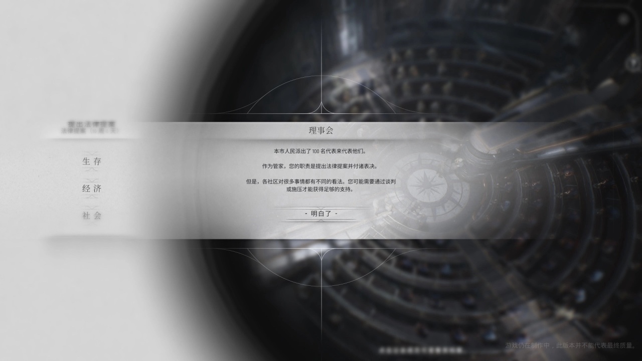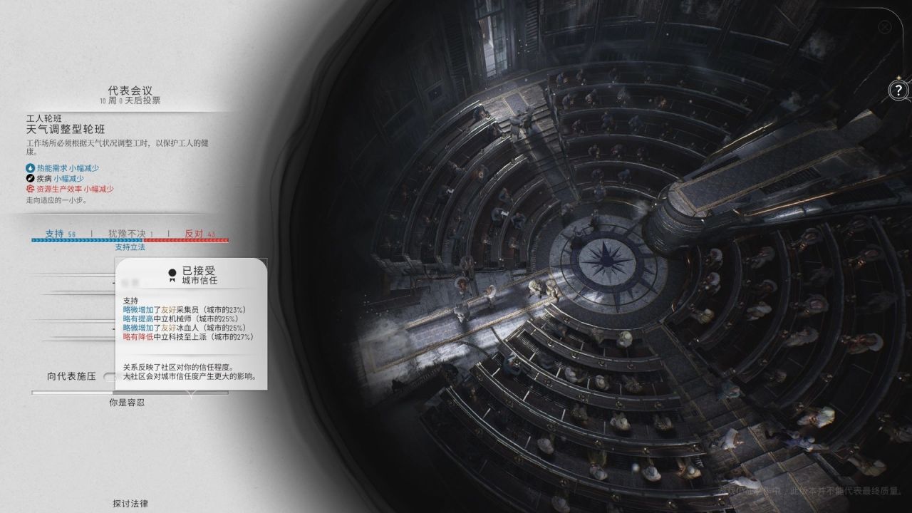 议员固定为100人,议员人数与党派规模密切相关,各党派的规模直接决定了在议会中的权重,如采集员规模若占有30%,议会中采集员的议员就为30人,机械师规模若占40%,议会中机械师的议员就为40人,法案的颁布需要议员的支持,也可以使用个人的威信(各党派对你-执政官的支持度,支持度高可强行通过法案,支持度低则会被推翻、下台、弹劾你-执政官)或者许诺某党派的需求(兑现诺言可拉高党某派的支持度,未兑现则会降低某党派的支持度),来拉高议员对法案的支持度,法案的通过需要支持的议员超过半票即为51人,二代法案可以随意更改,颁布法案的冷却时间受限为十周