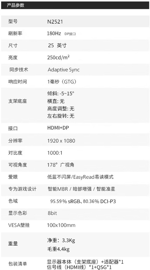 9月11日聯想旗下 25 英寸顯示器 N2521 現已開售,支持原生180Hz 高刷、1ms GTG 響應時間,屏幕分辨率 1920×1080,售價 599 元。