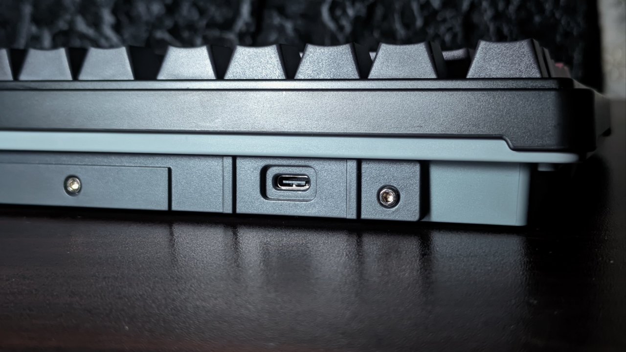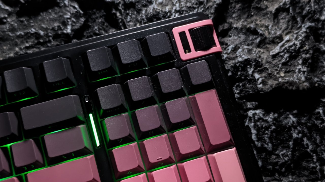整體類98配列,在鍵盤右上角有一個旋扭兼顧音量調節和模式切換的功能,旋扭旁有一個切換顯示,主要原因應該是這是採用了客製化鍵盤常見的鈹銅結構所以才這麼設計