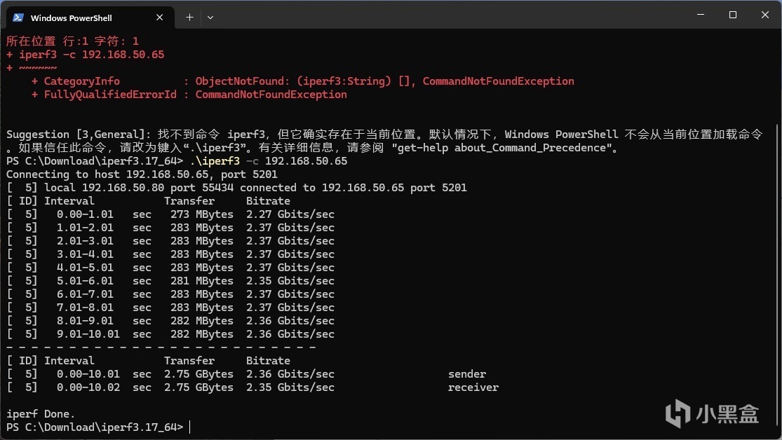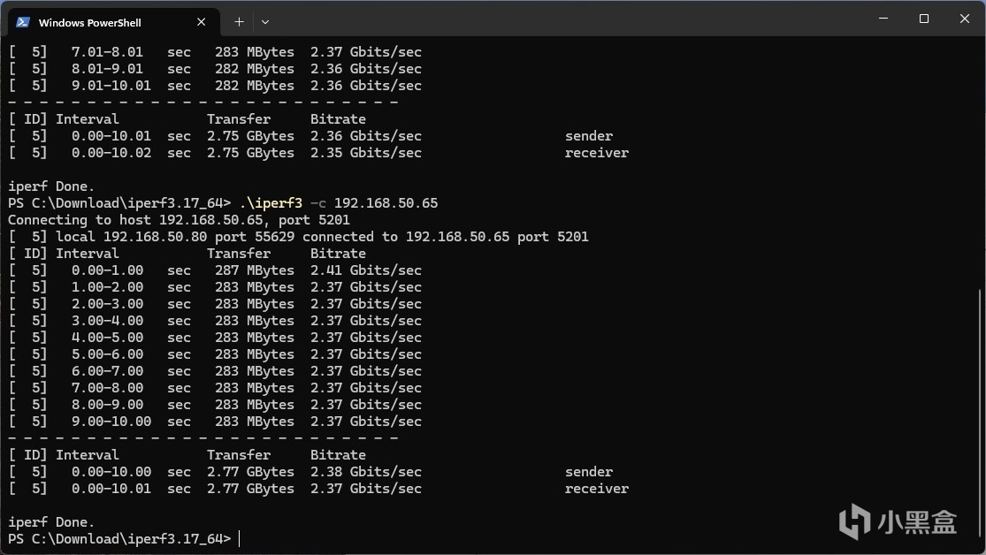 ▼蘑菇這裏搭建了一個測試平臺,一臺電腦連接路由器的10G接口,另一臺電腦連接路由器的2.5G接口,均爲有線連接,互相之間跑帶寬測試,可以看到傳輸的速度可以輕鬆去到2.4Gbps左右。