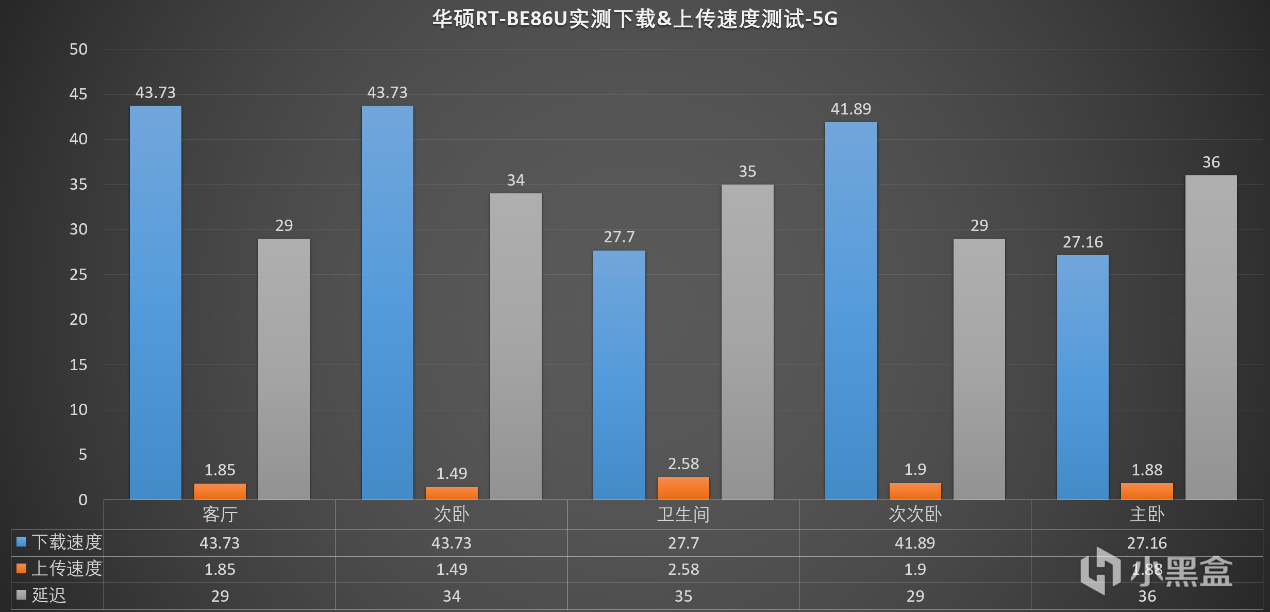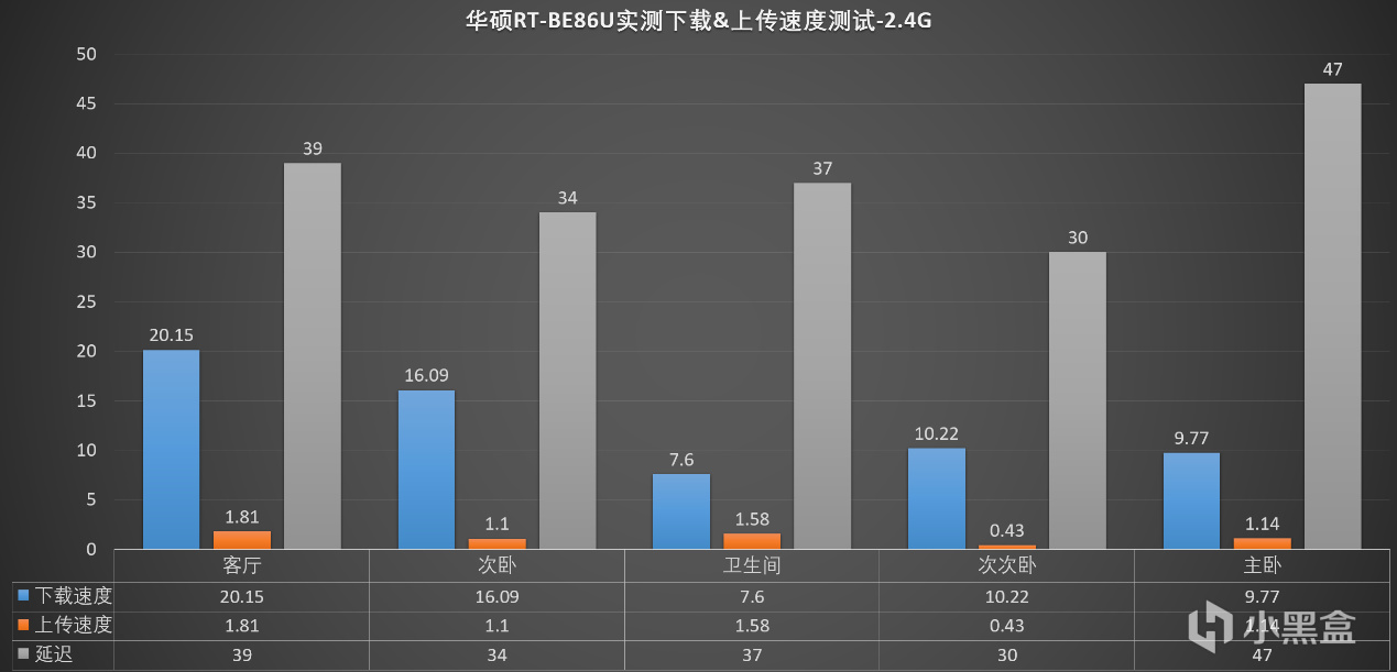 ▼把各個點的實測數據彙總下,僅在衛生間和主臥,下載速度達不到標稱的滿速,但依然有28MB/s左右的速度,平時看視頻毫無壓力。延遲方面,整體的表現差別並不大,基本都在30ms左右,表現非常不錯!