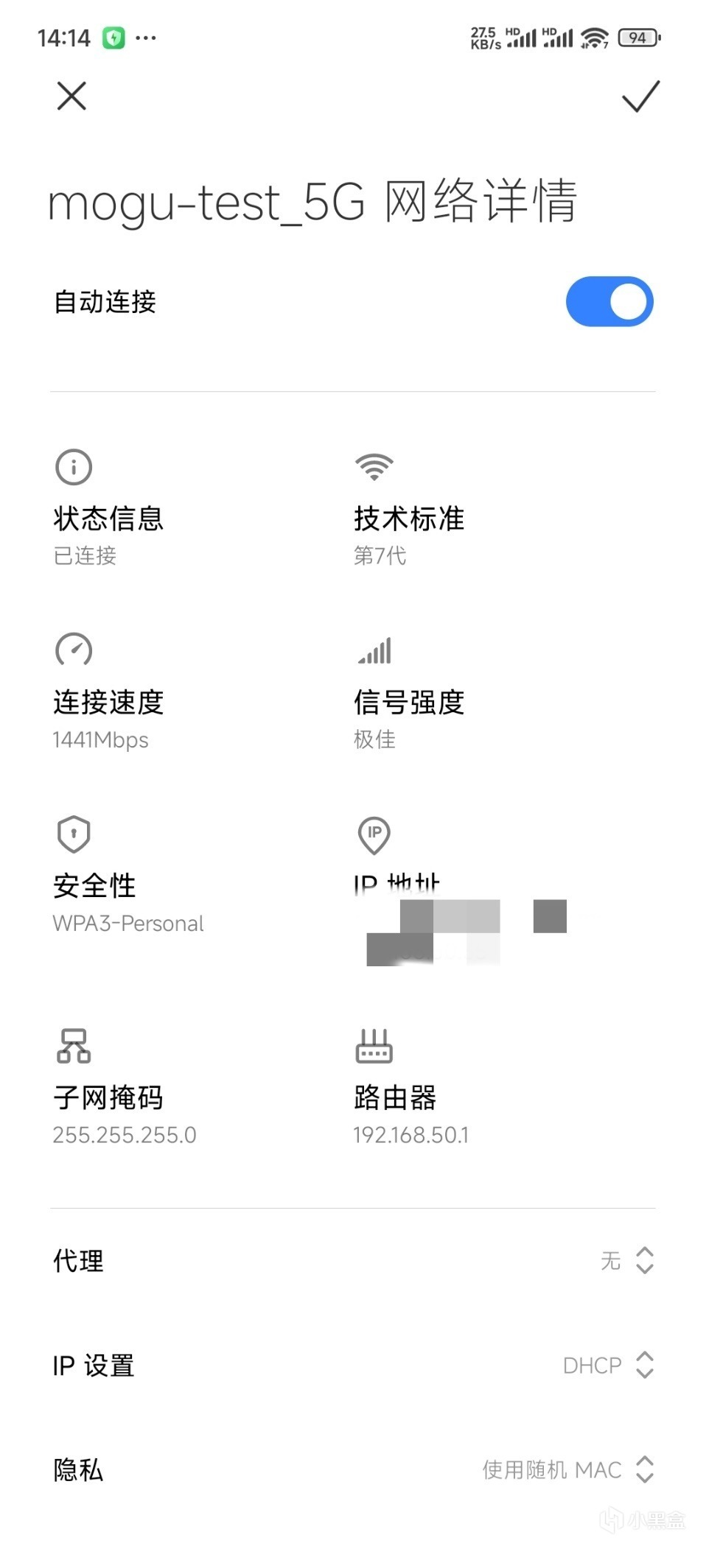 ▼使用的手機是小米13 Ultra,可以在系統內清晰的看到技術標準是WIFI 7,最大帶寬1441Mbps。