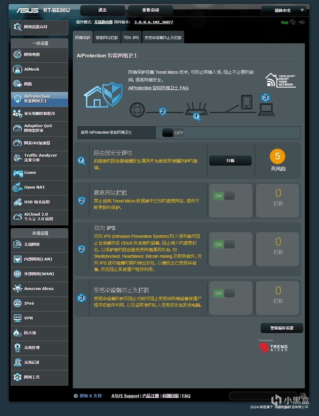 ▼這款路由器內置了一個Ai網絡神盾的功能,這個AiProtection Pro智能網絡衛士功能,其巧妙的運用華碩的Ai算法,和雲端的數據庫相結合,可以快速偵測並阻止一些網絡危險,讓日常用網更加的安全、放心。