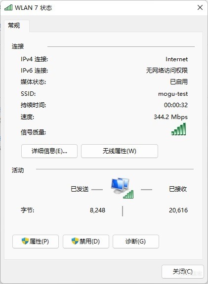 ▼連接路由器的2.4G的WIFI,系統內顯示帶寬在344Mbps左右。