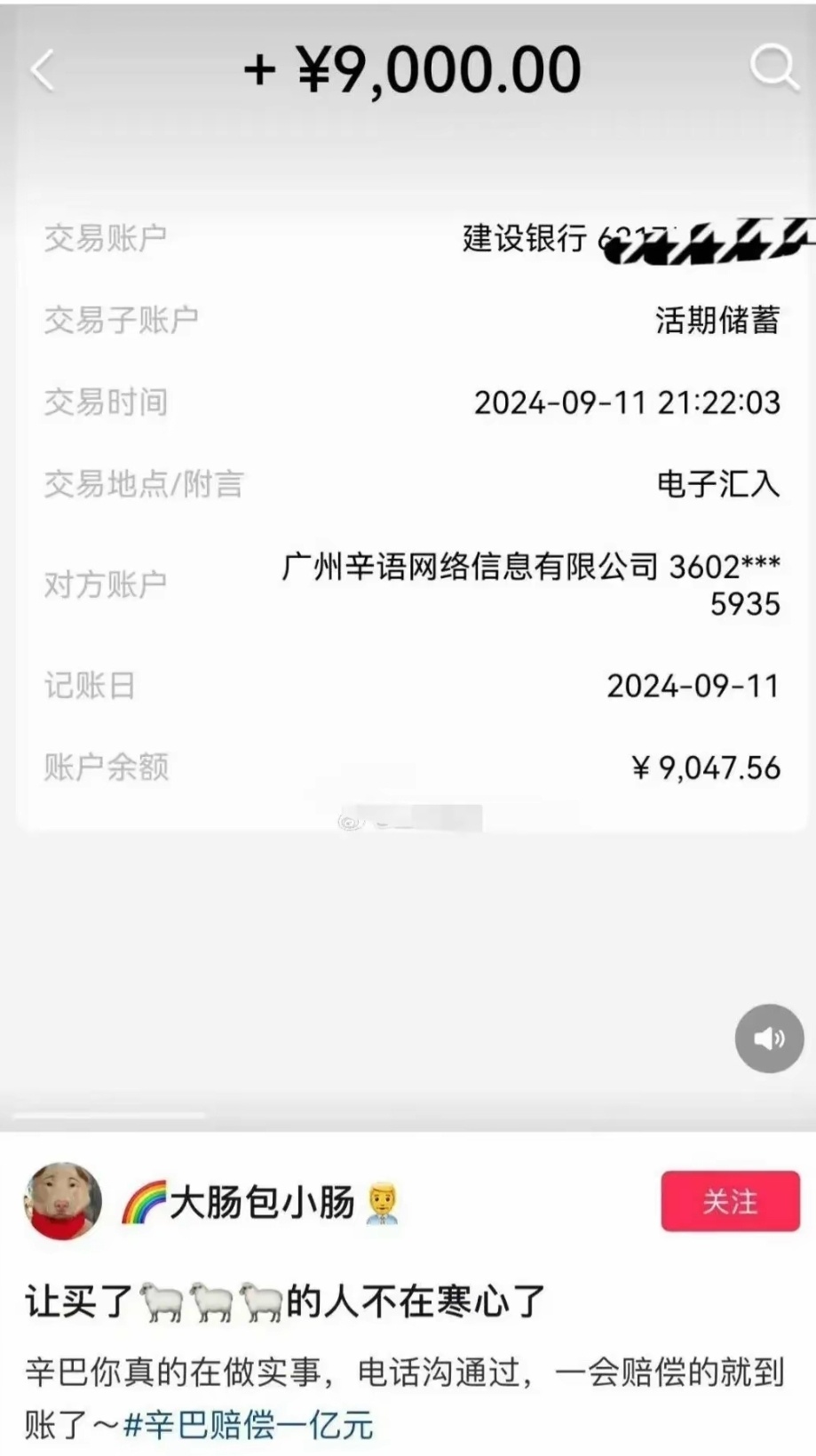 據悉,辛巴方面對“梅菜扣肉”的“行業慰問金”爲每單188元,對“茅臺”的“行業慰問金”則高達每單9000元。從網友曬出的到賬截圖來看,款項確實來自辛巴公司——廣州辛語網絡信息有限公司。