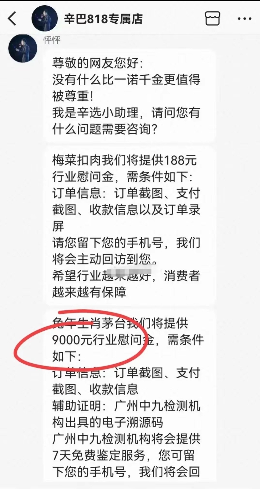在辛巴賬號最新視頻的評論區,不少網友曬出了與辛選客服的對話截圖和到賬信息。根據截圖顯示,消費者只需在與辛選客服的對話中發送“梅菜扣肉”、“茅臺”等關鍵詞,客服便會回覆稱將提供“行業慰問金”。