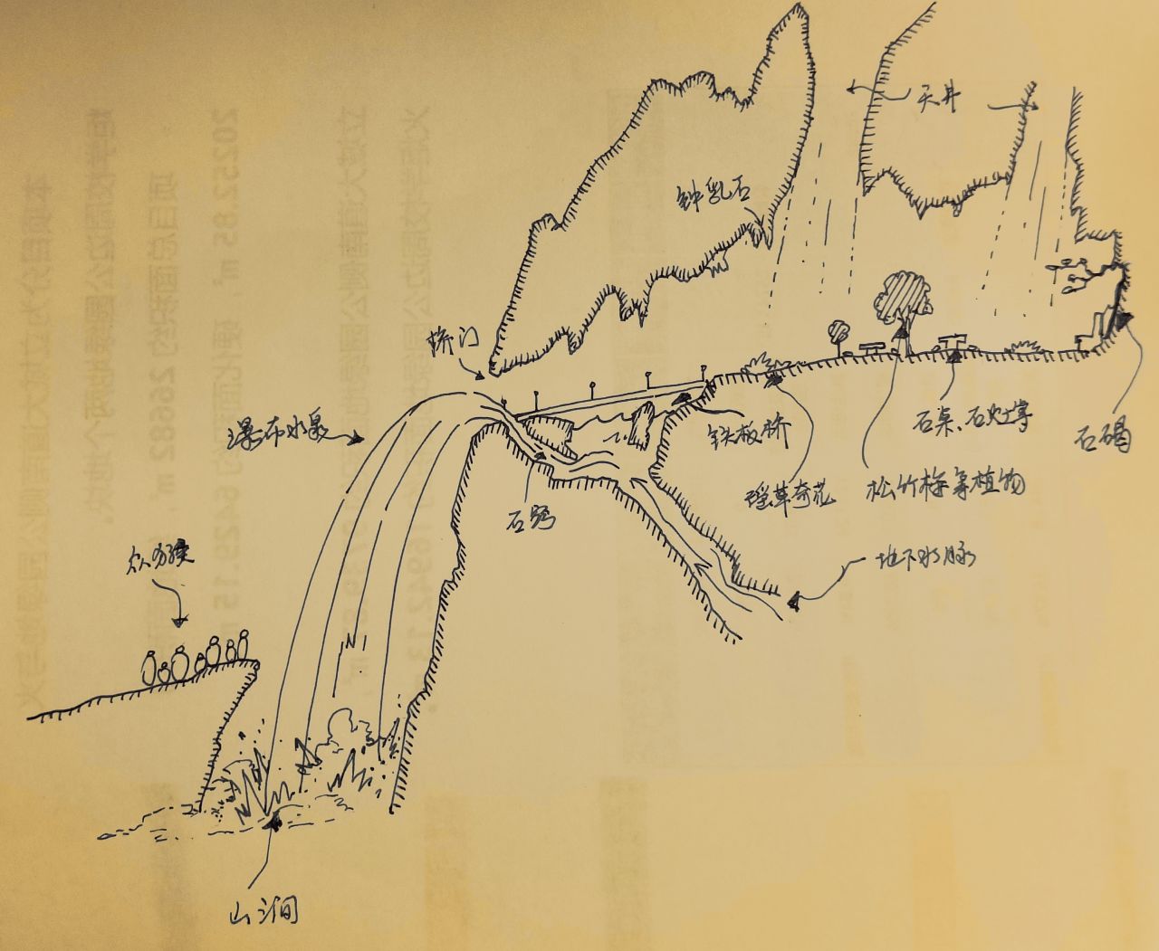水帘洞外面的瀑布应是在山崖中段的一个洞口流出来,群猴进水帘洞前后的表现也可看出,都以为瀑布内部应是充满了激流的水道,所以才会问“水有多深?”。没想到里面是个天造地设的家当,具体结构请看本人绘制的示意图。