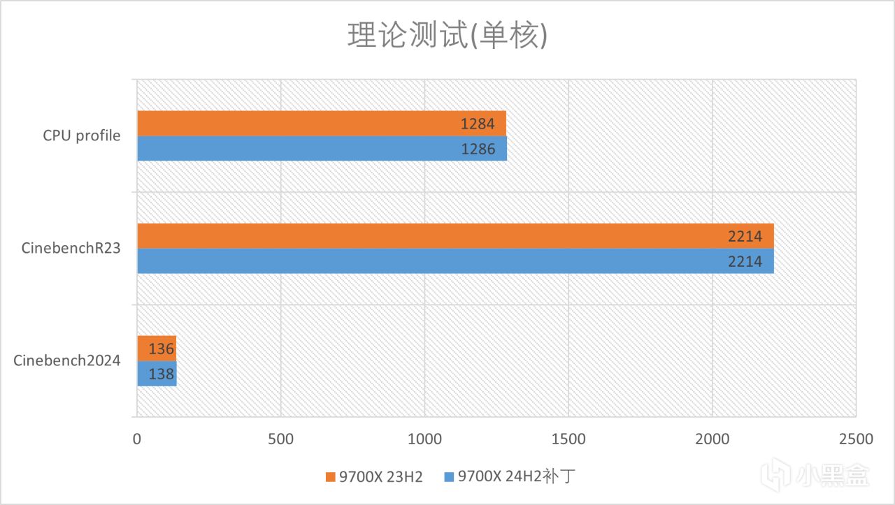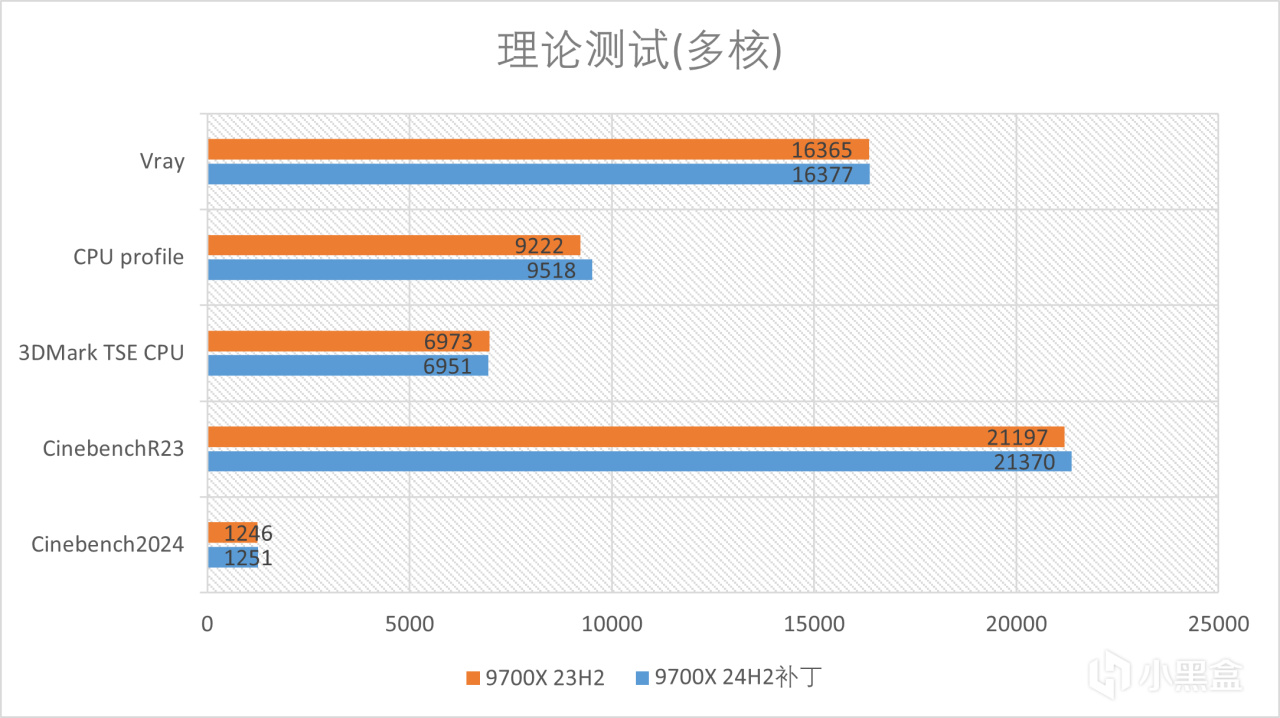 首先是理論性能部分,9700X雖然是8c CPU,但因爲單核性能進步的原因,已經基本實現了8c Zen5硬打16c的Zen2的神奇景象,每一代都在切實進步累積起來也是很驚人的。而9700X在兩個版本的win11上理論性能並沒有很明顯的區別。在單核測試中結果也是類似的,看來對於比較沉重的高負載任務,例如渲染等,更好的分支預測沒有帶來明顯的性能提升,不過這也是符合預期的,畢竟官方的報告也是集中在遊戲